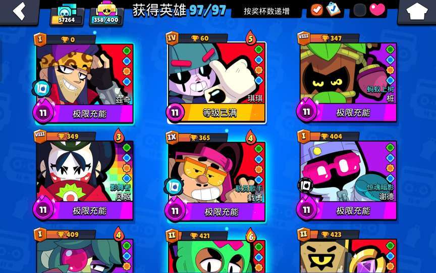 有琪琪兹奇目前全英雄97个全满级全极限充能全妙具全星辉每个都有两个以上强化装备,皮肤多且有至臻皮多!