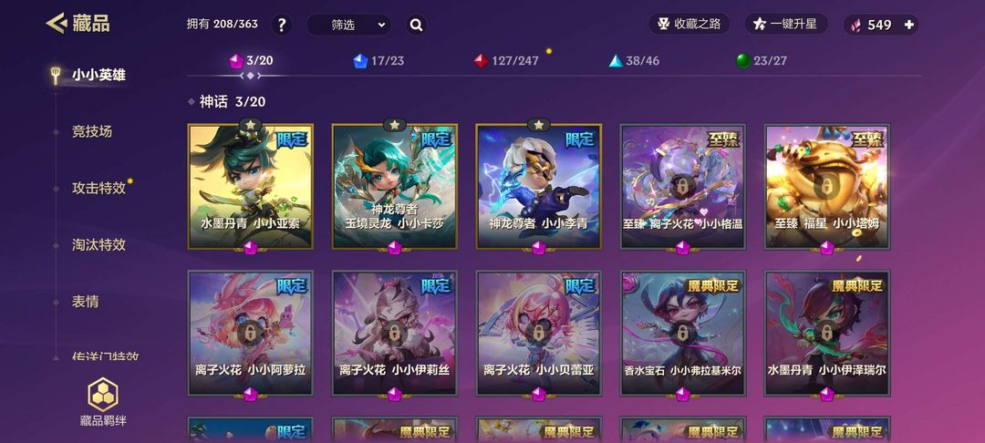 q区 V8神话有神龙系列李青卡莎和水墨丹青亚索小小英雄20个 竞技场有神龙之巅夜战楼城等攻击特效不等