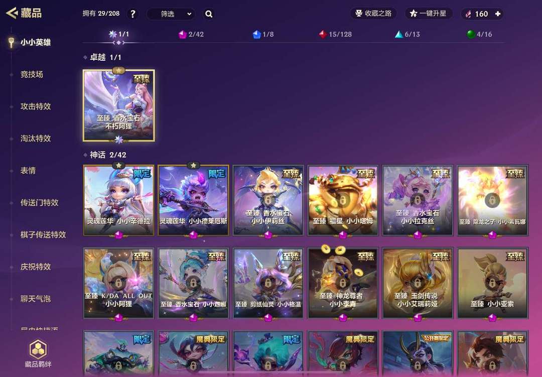 装备描述:卓越级小小英雄:至臻香水宝石不朽阿狸; 神话级小小英雄:灵魂莲华小小辛德拉,灵魂莲华小小德莱厄斯; 棋盘:灵魂莲华世皆如梦,德玛西亚团结圣坛,铲铲市美食步行街; 攻击特效:游龙出海;