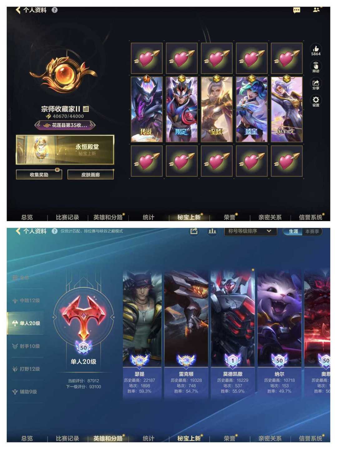 限制: 租号5次及以上 | 撤单率<50%才可租用此帐号装备描述:欢迎光临❤️ 哈喽啊 想必经常于这里租号的老板都知道我只营中高端系列,故账号价值几乎都在5w以上,账号珍贵大家都清楚。 但是近期呢身边同行那里遭遇大量封号,秉持无违规零封号的原则,如发现账号出现封号,举全力必让你吃上大米饭,无太多资金,百个还是拿的出来的。 家族大舅于安徽丨陕西丨山西开设连锁律师所,处理这种小案子也是信手捏来,两到三个月就能轻松使你入编,喔,不是进去了就能不赔偿喔,一个号赔个大几万那还是要的^O^。 tx喜通设备30天内可锁消费记录丨可查支付❤️西丨60天内可锁设备码❤️请勿因一时之快或者觉得账号一般就来挑战哦~ 当然了,新年到,新气象,祝愿大家在租用账号后都能天天开心,游戏顺利,上分如喝水! 长期招在榜国服/历史国一/高分收藏合租 ✡️感兴趣的话请于兜音連係:魂魂sup 哦 ✨不掉信誉分的情况下,排位任您畅玩下单前多看看哈,恶意撤单会被关小黑屋哦✨ ❤️最后感谢平台,让它让我们相遇^_^❤️