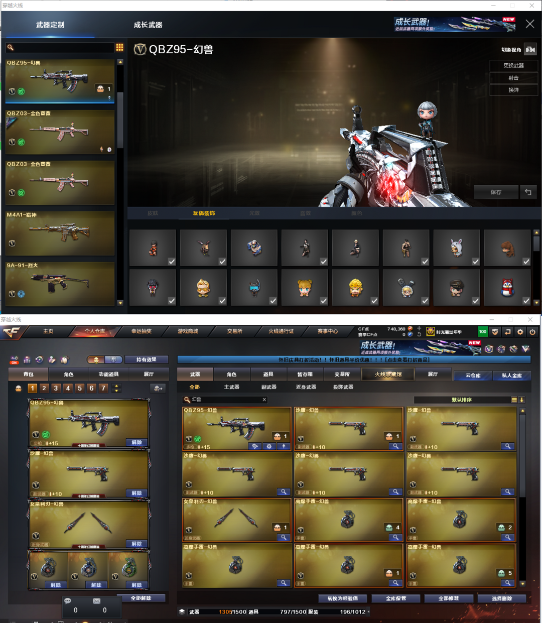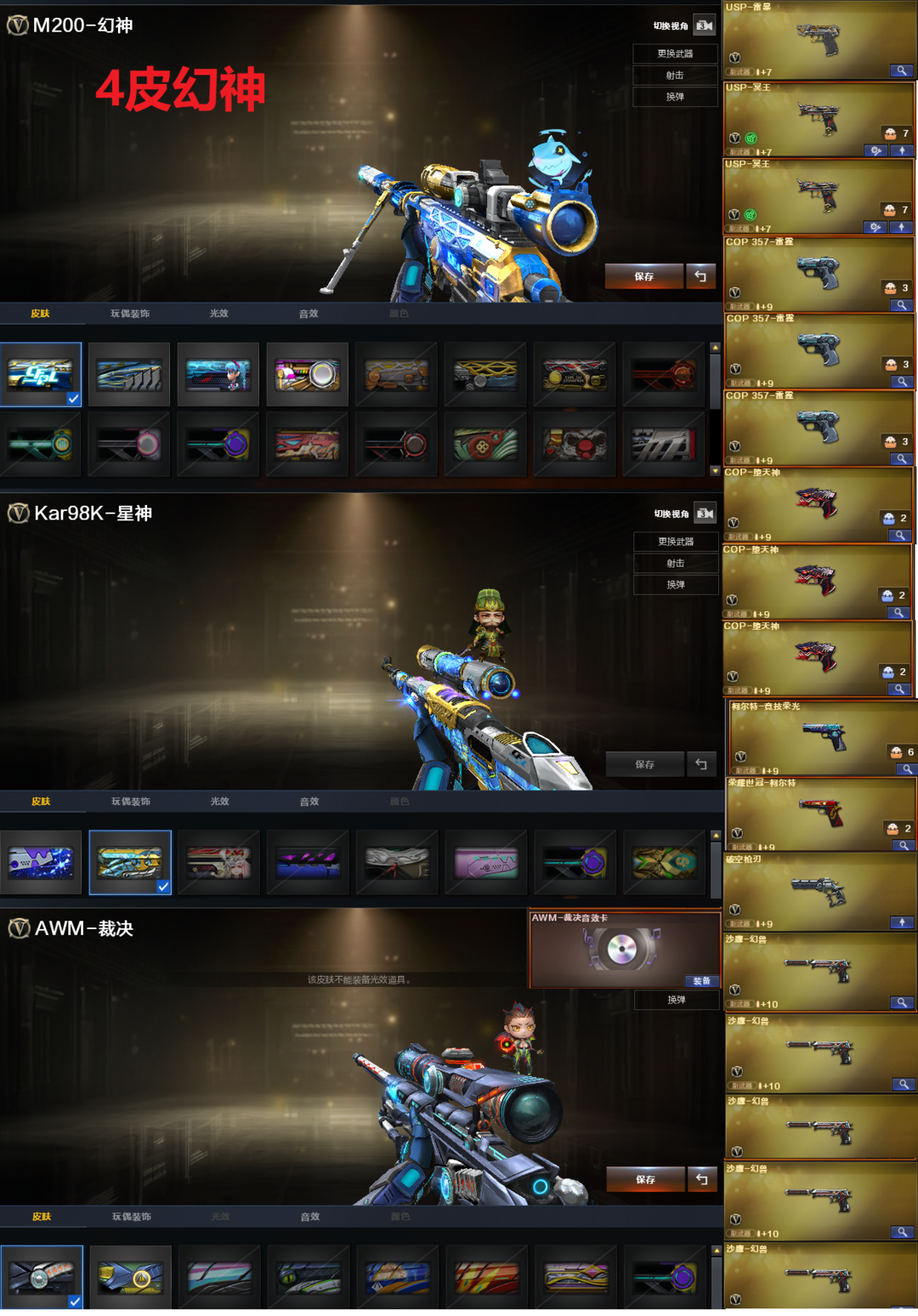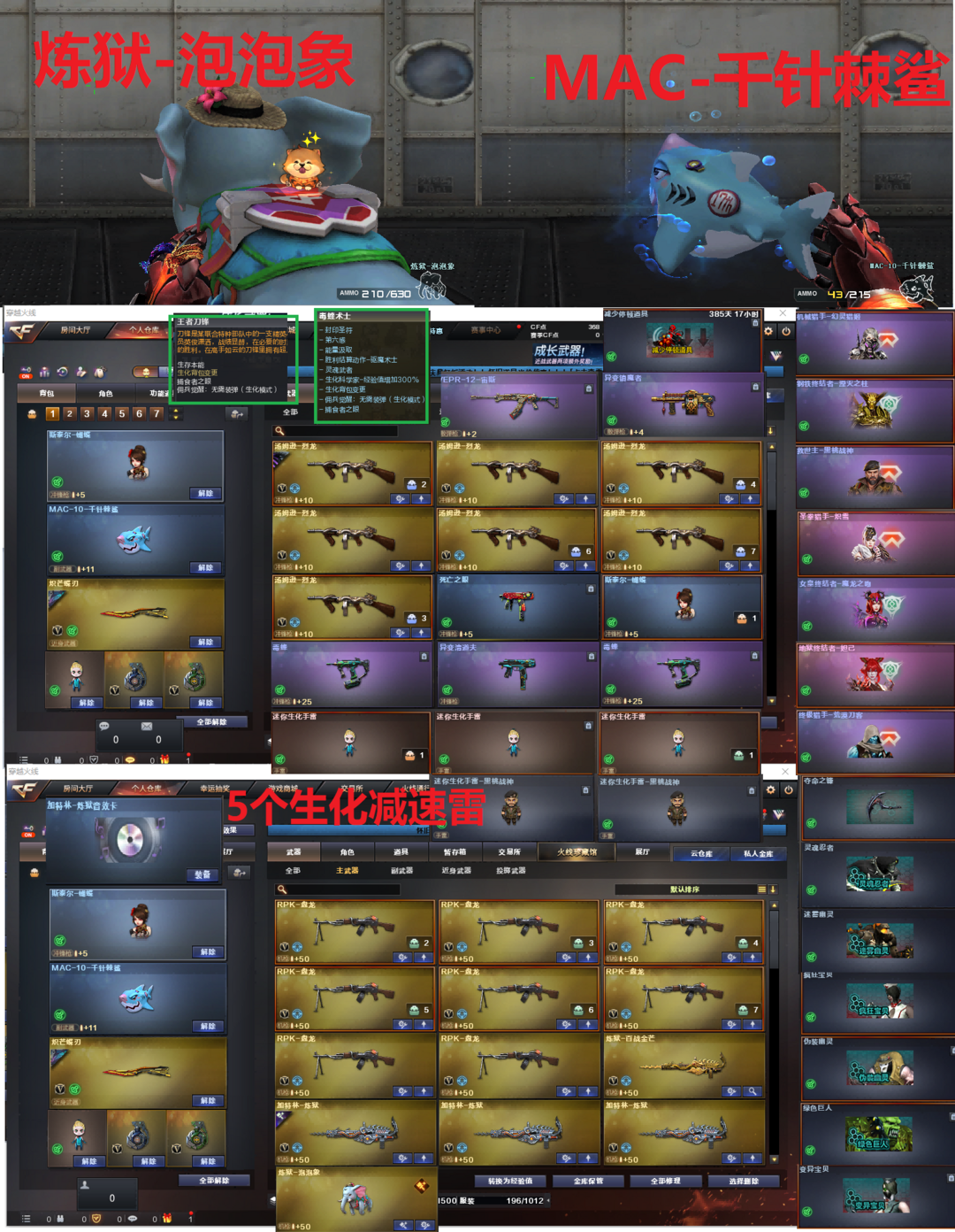 装备描述:排位:可以------------------生化四防极品压力号(生化模式换背包、看血量):无需换弹、6烈龙、6盘龙、6炼狱+音效、炼狱泡泡象、斯太尔蝴蝶、毒蜂、VPER-12-宙斯、异变清道夫、异变镇魔者、死亡之眼、MAC千针棘鲨、手斧镜、炽芒蝶刃、5个生化减速雷、减少停顿道具、超级对讲机、全部弹匣、、、、、、爆破四防:4皮幻神(冠军之幻、白鲨、电流骇客、动感闪耀皮肤)、王者幻神、M200-竞技荣光、2个USP冥王、USP雷暴、3个COP雷霆、3个COP堕天神、柯尔特竞技荣光、破空枪刃、5个幻兽沙鹰、世冠柯尔特、QBZ幻兽、传说圣谕、G36幻影、白虎、QBZ03-独角、QBZ金色蔷薇、传说暗裔、传说辉光、传说夜影、、、裁决音效、蔷薇音效、白虎音效、炼狱音效、雷神音效、毁灭音效、火麒麟音效、黑骑士音效、、、5套幻兽、7套雷霆、7套雷暴、7套堕天神、7套夜魔、2套竞技荣光、1套玄豹、、、生化四防(毒蝰术士、王者刀锋)、爆破四防(传说星骇、凌霄、王者春、王者貂蝉、职业经理)