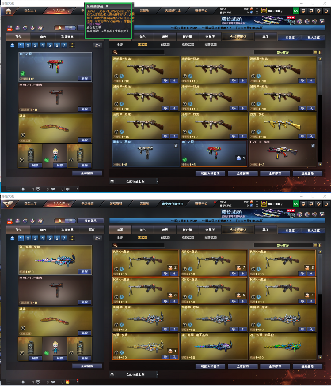 装备描述:排位:可以-----------------------爆破全装:幻神、2把COP雷霆、QBZ金色蔷薇、金色小号、雷霆套、、、7套雷霆、、、生化人物(圣诞潘多拉)