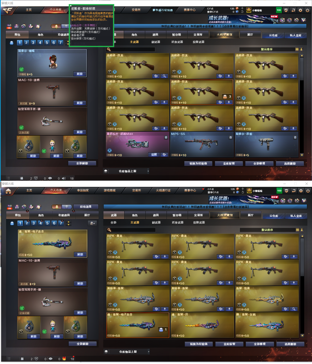 装备描述:排位:可以-----------生化四防(可以查看生化僵尸血量):无需换弹、6烈龙、6盘龙、炼狱、斯太尔蝴蝶、死亡之眼、MCA涂鸦、生化减速手雷、全部弹匣、超级对讲机、、、、、、、、、、、爆破全装:幻神、USP雷暴、世冠柯尔特、2个幻兽沙鹰、传说光耀、白虎、QBZ金色蔷薇、、、毁灭音效、黑骑士音效、、、2套幻兽、3套雷暴、、、生化四防(职业经理)爆破四防(王者国色天香)