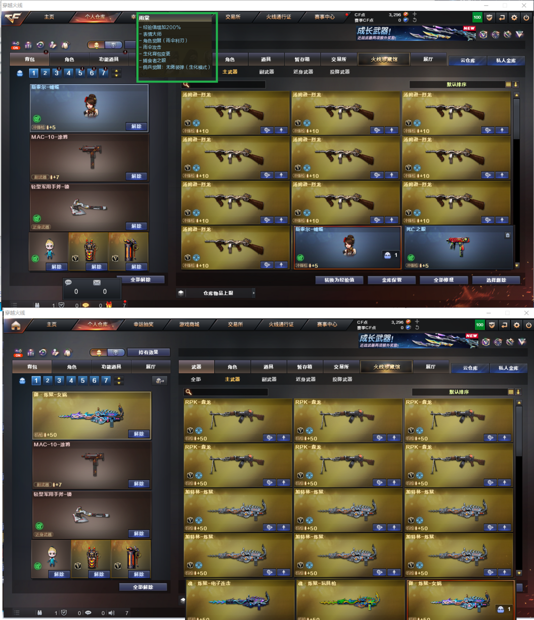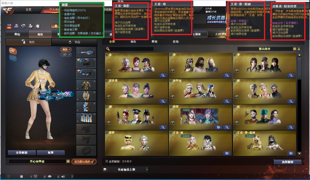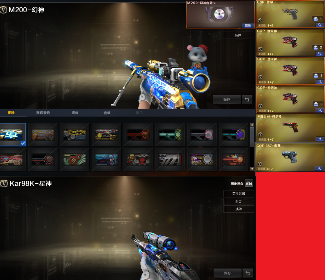 装备描述:排位:可以、、、、、、、、、、爆破四防:幻神音效卡(冠军之幻皮肤)、王者幻神、98K星神、USP雷暴、3个COP堕天神、COP雷霆、世冠柯尔特、传说圣灵、白虎、QBZ金色蔷薇、王者蔷薇、金色小号、、、幻神音效、蔷薇音效、毁灭音效、雷神音效、黑龙音效、火麒麟音效、黑骑士音效、、、8套雷霆、7套雷暴、6套堕天神、、、爆破四防(王者春、王者貂蝉、王者魅影、职业经理)