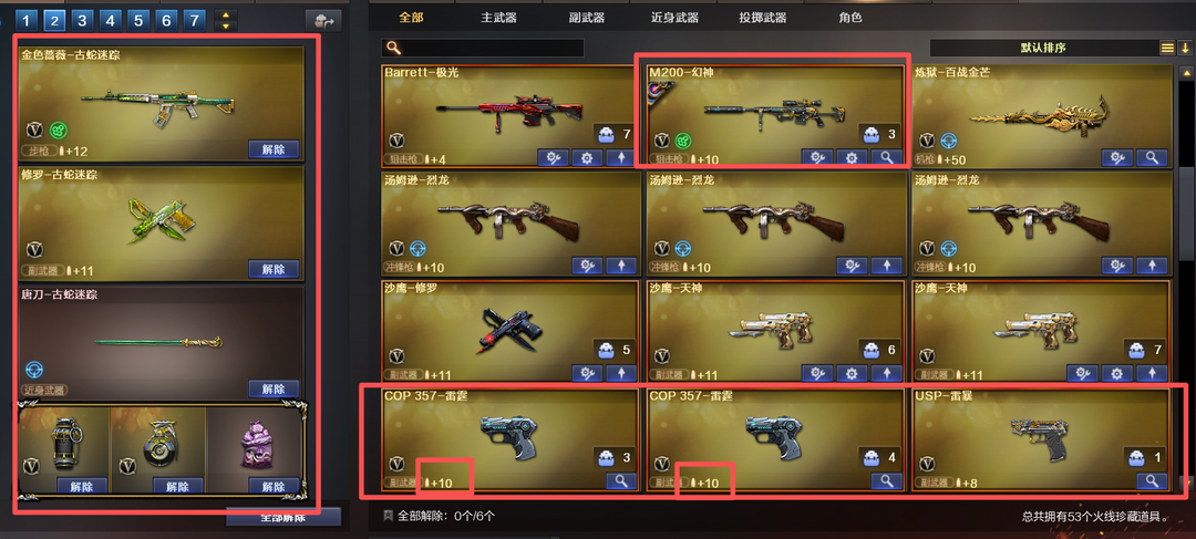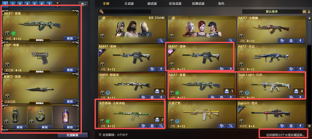 装备描述:东部⭐52V⭐幻神哈拉少带卡+2雷霆COP+USP雷暴⭐白虎⭐古蛇QBZ套⭐雷暴套⭐满套雷⭐生化蝴蝶