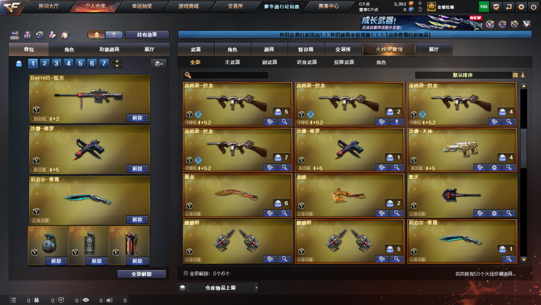 装备描述:英雄武器:汤姆逊-烈龙;烟雾弹-堕天神;高爆手雷-堕天神;闪光弹-堕天神;龙啸-堕天神;麒麟刺-堕天神;高爆手雷-雷霆;烟雾弹-雷霆;闪光弹-雷霆;雷霆之锋;麒麟刺;M4A1-猎神;Barrett-毁灭;沙鹰-天神;沙鹰-修罗;AK47-黑武士;AK12-天启;龙啸;擎天;M4A1-黑骑士;M4A1-玫瑰精灵;屠龙 角色:葵;樱;炫;迷迭香;飞虎队;幻影;复仇者;陈龙野-X;陈龙野-Y;猎狐者-英特尔;娜塔莎;救世复仇;精英部队;灵狐者;烈锋;王力宏;青霞仙子;剑齿虎-X;圣诞潘多拉-X;芳心审判者;灵狐者;铁骑