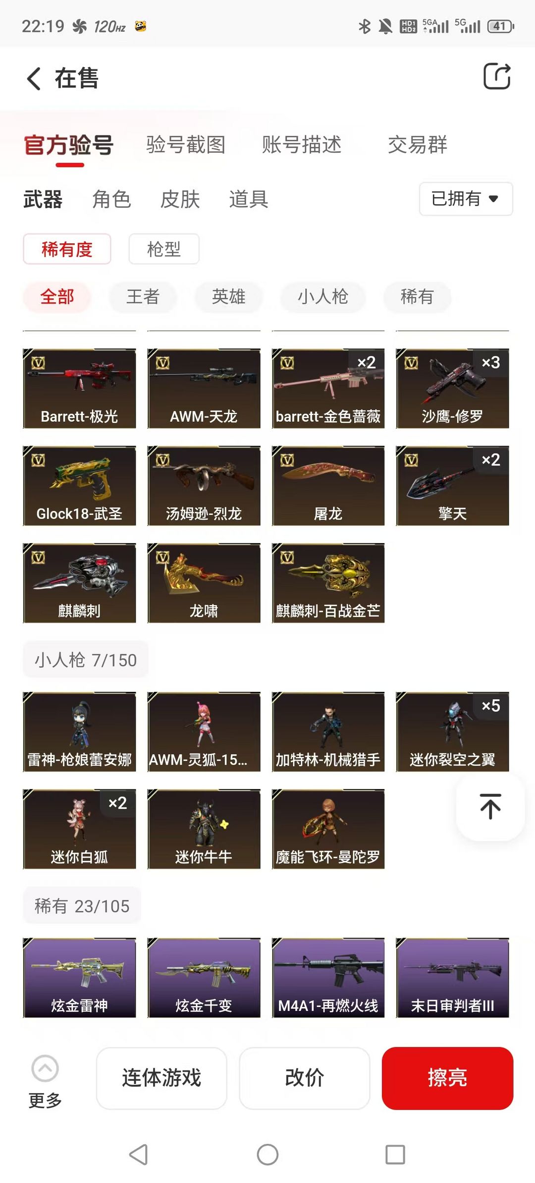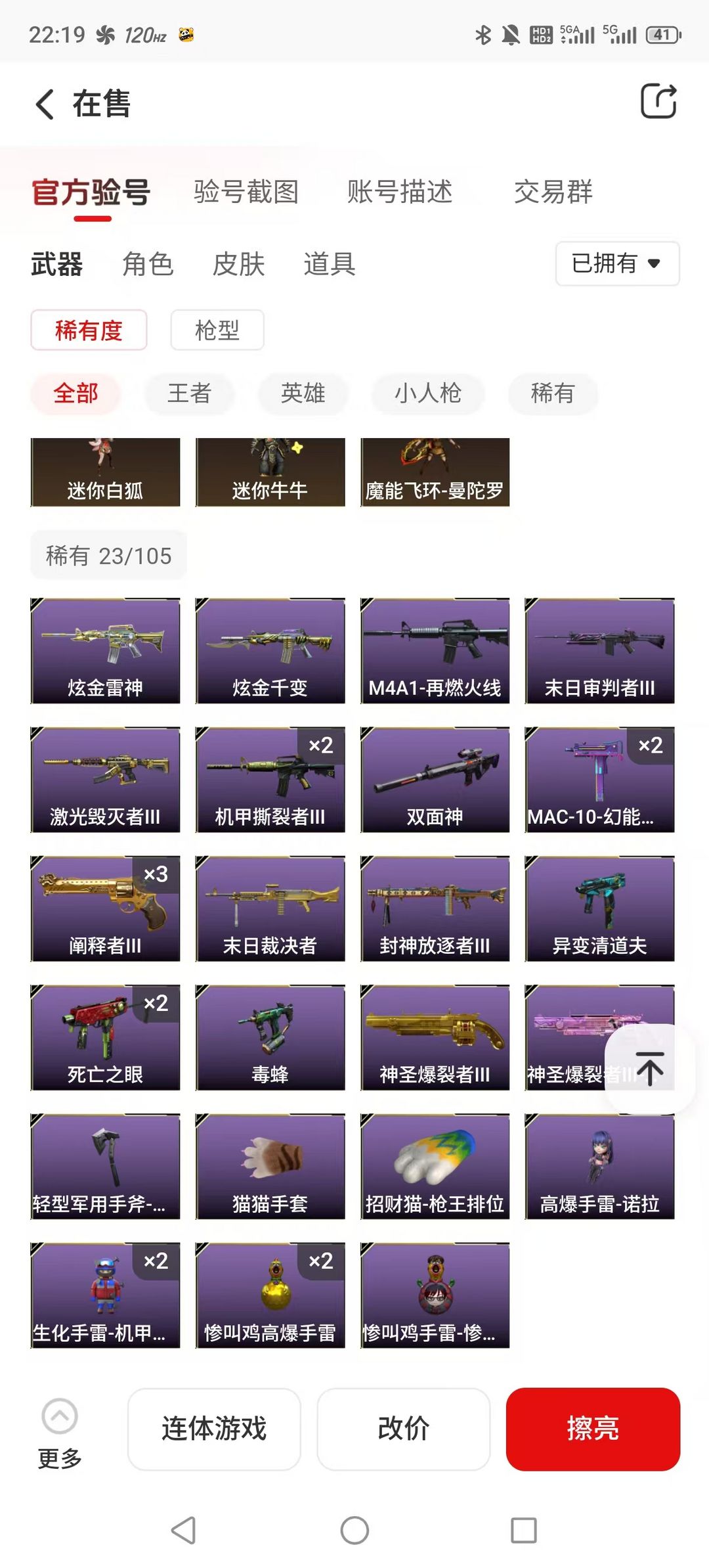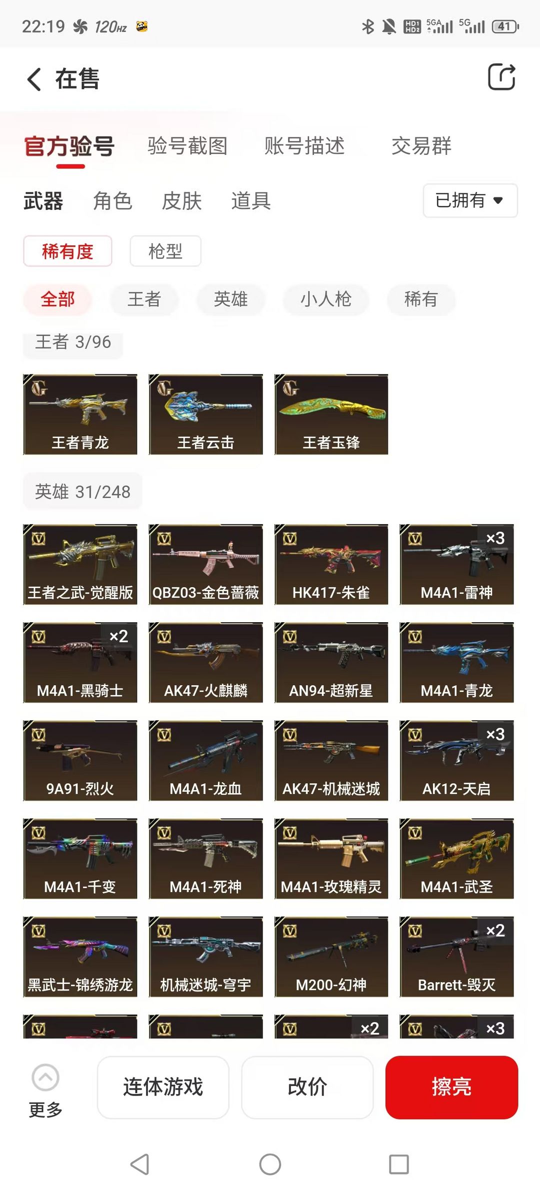 装备描述:王者武器:王者青龙;王者玉锋;王者之武-觉醒版;炫金千变;王者云击;炫金雷神 英雄武器:机械迷城-穹宇;黑武士-锦绣游龙;M4A1-青龙;AWM-天龙;AK12-天启;QBZ03-金色蔷薇;Barrett-极光;AK47-机械迷城;麒麟刺;M4A1-龙血;M4A1-玫瑰精灵;沙鹰-修罗;HK417-朱雀;9A91-烈火;Barrett-毁灭;M4A1-雷神;M4A1-黑骑士;AK47-火麒麟;M200-幻神;M4A1-死神;擎天;AN94-超新星;M4A1-千变;屠龙;M4A1-武圣;Glock18-武圣;汤姆逊-烈龙;龙啸 角色:瞳;关小雨;猎狐者;飞虎队;刀锋;潘多拉;雷霆-β;复仇者;堕天使;活力灵狐;G.E.M.邓紫棋;猎狐者-英特尔;娜塔莎;救世复仇;救世主;精英部队;灵狐者;烈锋;影武者-X;王者-救世主;龙儿;救世主-X;樱-青春偶像;剑齿虎-X;圣诞潘多拉-X;代号:翼;代号:翼;幽;芳心审判者;超能特工;风暴女;电竞少女;沃特X;蔚蓝;雷豹;潜龙队 道具:云山科技背包;绿色巨人;灵魂忍者;迷雾幽灵;疯狂宝贝;防化服;C4工具钳;手雷包;防弹衣;防弹头盔;疯狂宝贝;防化