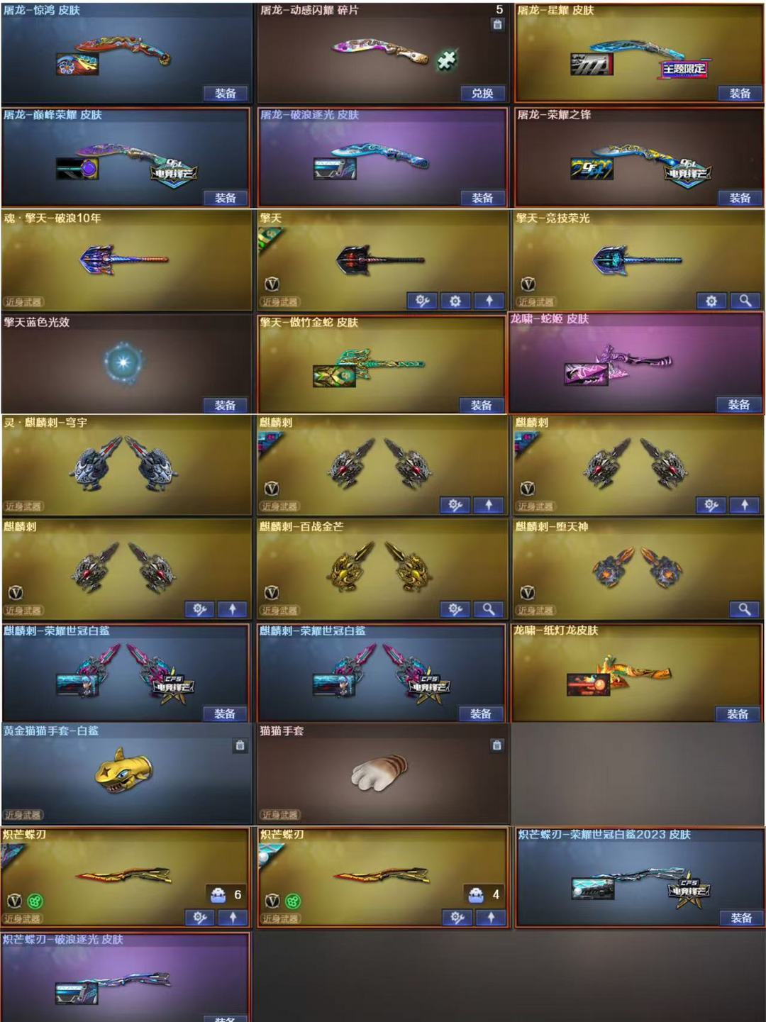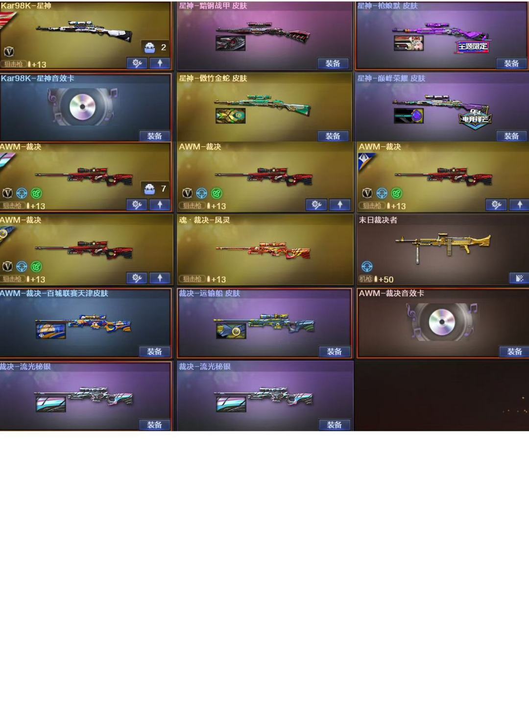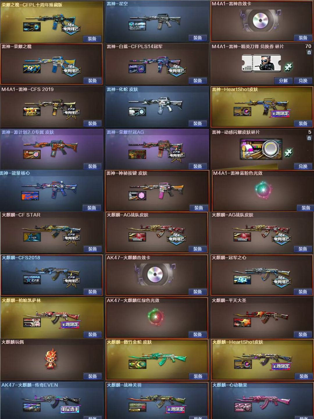 装备描述:13幻皮带卡,传幽瞳,隼四防,冠军刀,冠军特,3usp冥王,usp雷暴,柯尔特电竞之星,5柯特白鲨23,柯特世冠,王者cop小枪,双炽芒蝶刃双皮肤,蝴蝶斯泰尔,六烈盘黑。4星神皮带卡。3裁决皮带卡,雷神10皮以上带卡(价值3000十周年臻藏皮),火麒麟毁灭均10皮以上带卡
