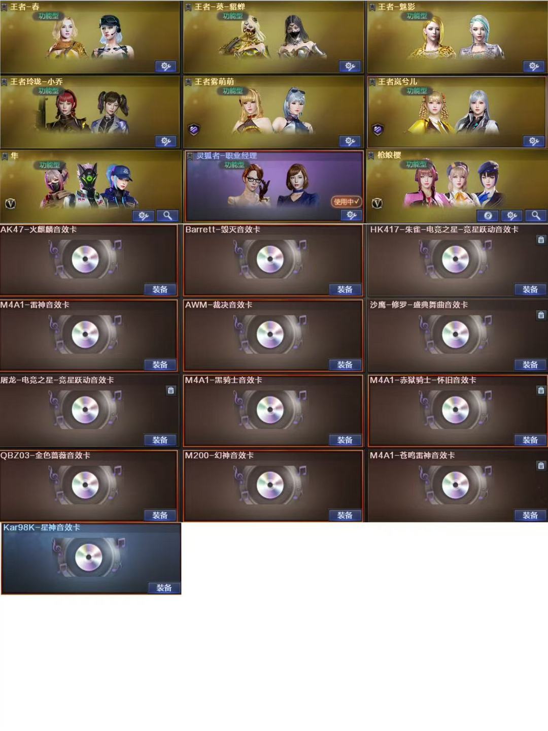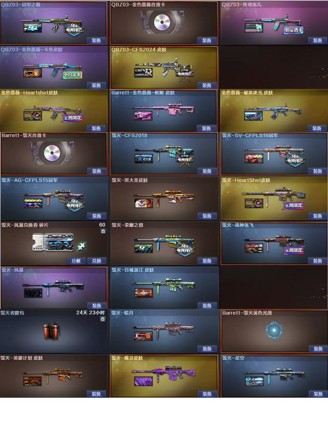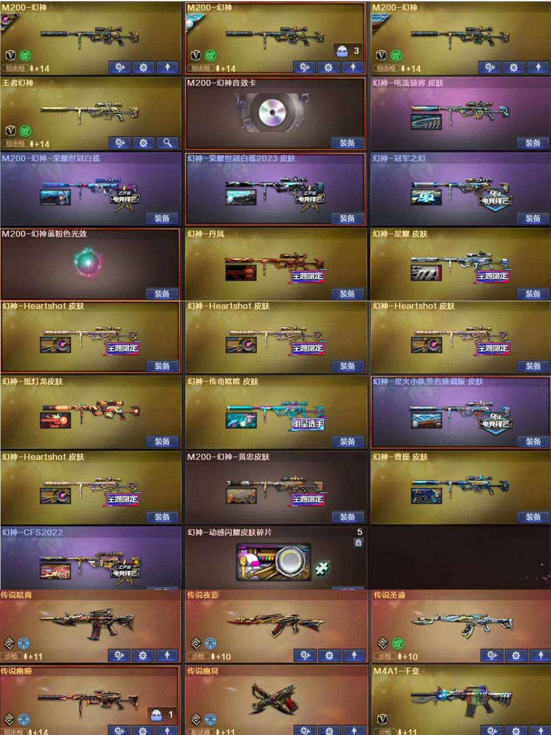 装备描述:13幻皮带卡,传幽瞳,隼四防,冠军刀,冠军特,3usp冥王,usp雷暴,柯尔特电竞之星,5柯特白鲨23,柯特世冠,王者cop小枪,双炽芒蝶刃双皮肤,蝴蝶斯泰尔,六烈盘黑。4星神皮带卡。3裁决皮带卡,雷神10皮以上带卡(价值3000十周年臻藏皮),火麒麟毁灭均10皮以上带卡