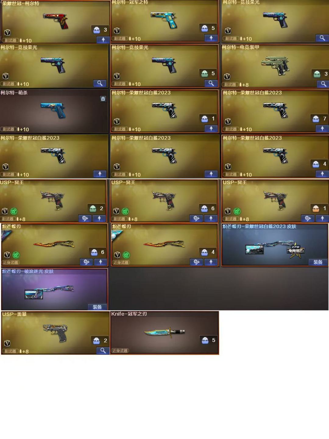 13幻神皮4星神皮3裁决皮,幽瞳,隼,2炽芒蝶刃冠军刀,冠军特,3usp冥王,usp雷暴,5柯特白鲨