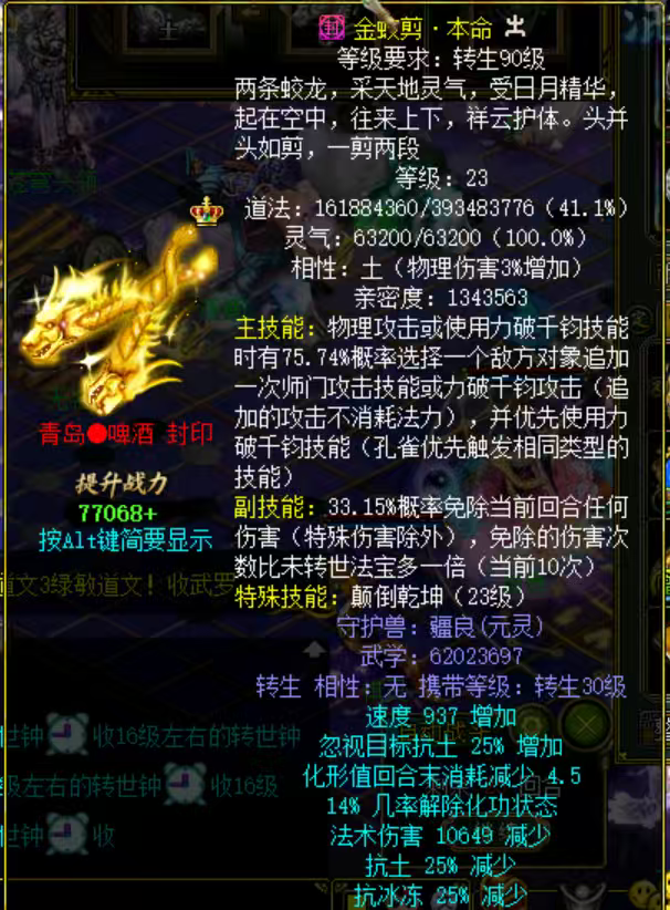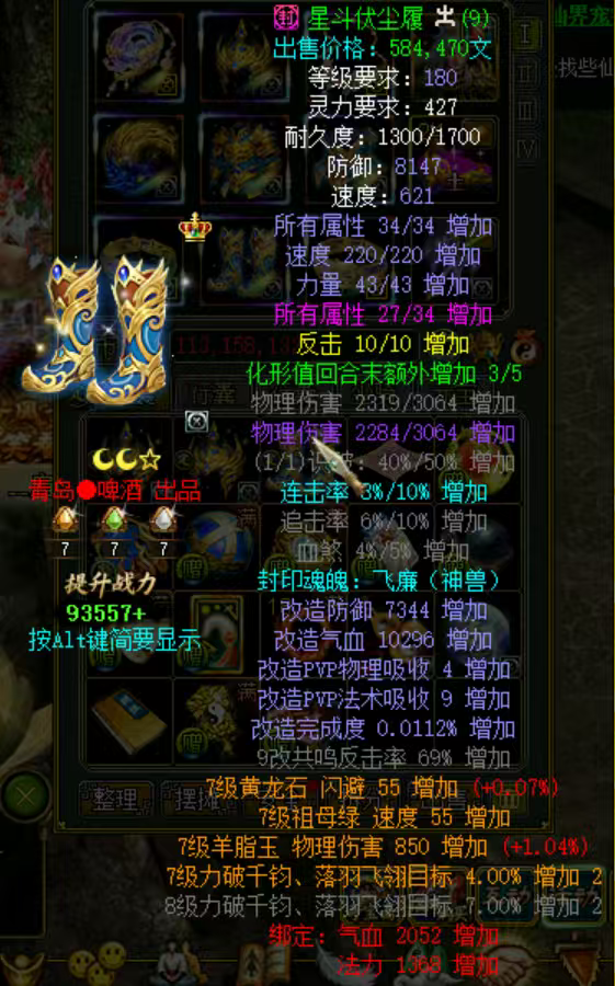 装备描述:极品8件改9孔雀,连击反击都有,剪刀也已经融合珠子,双道纹,能做任务能pk