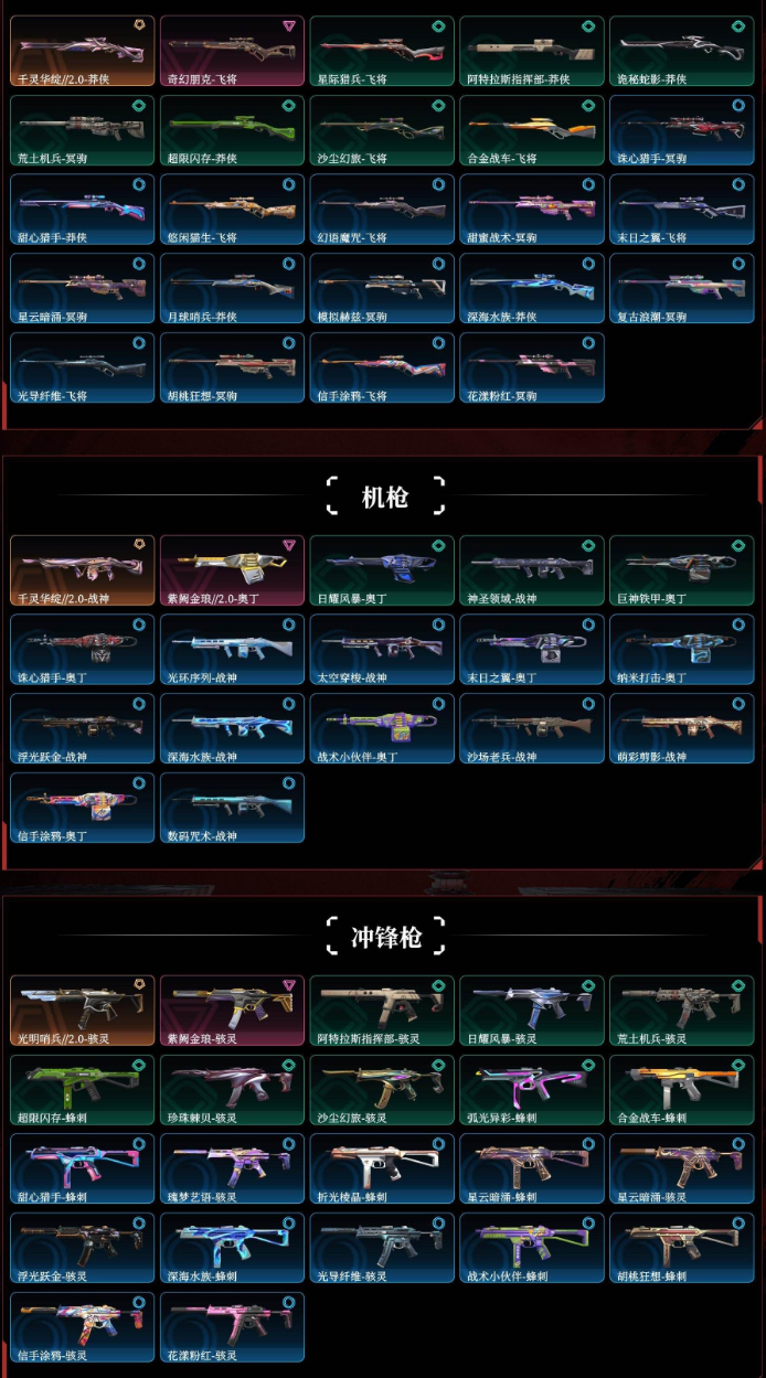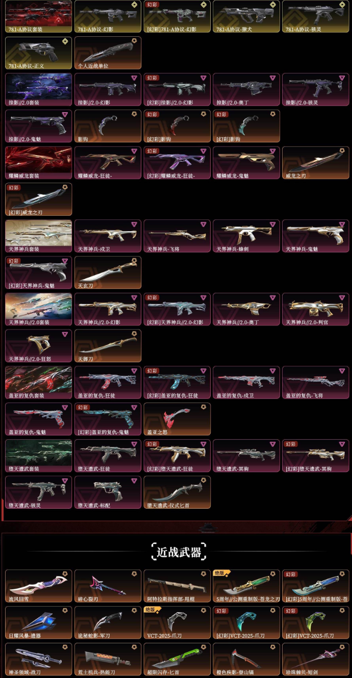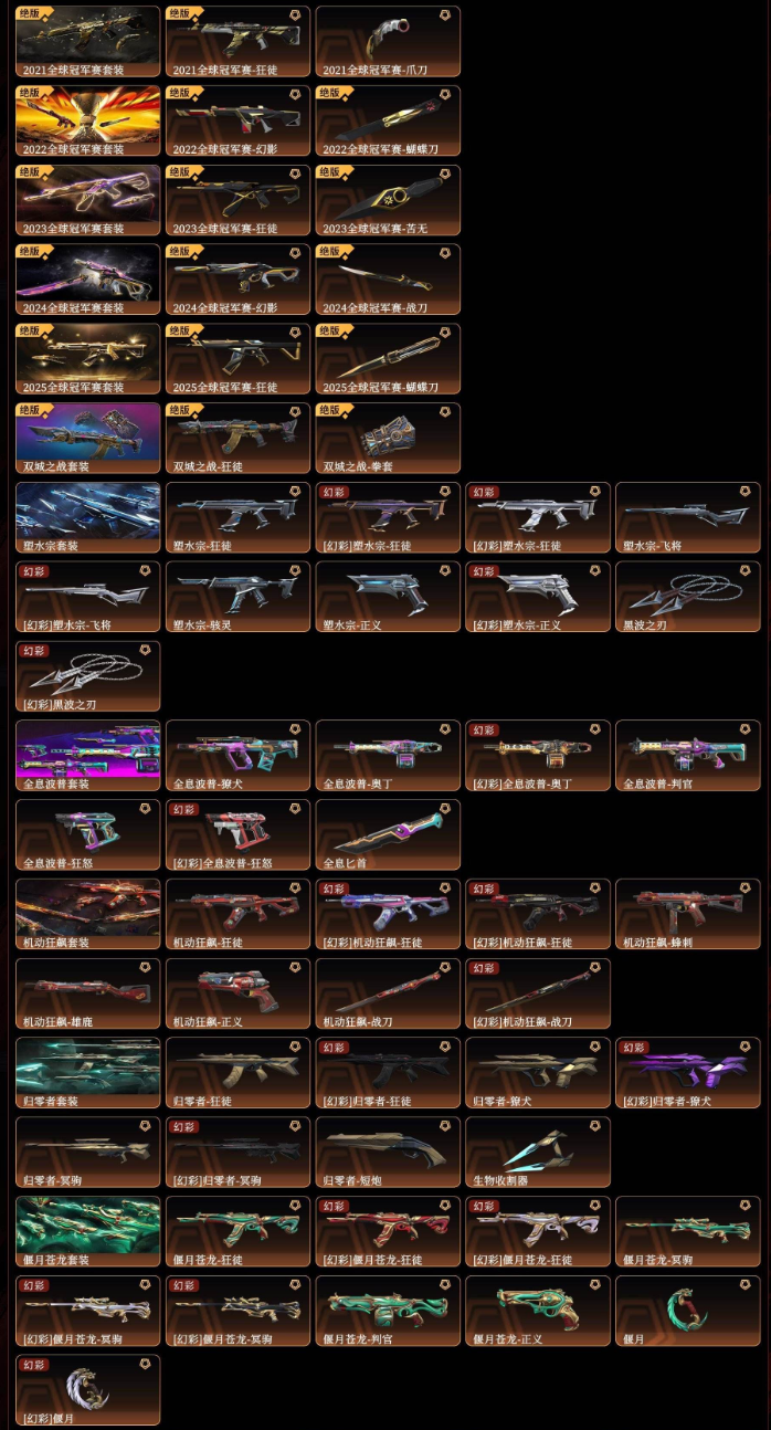 装备描述:千灵2.0套装2025冠军掠影2.0套装22冠军苍龙之刃离子狂徒VCT2025爪双城之战狂徒拳套全特效掠影狂徒2024全球冠军满特效2021全球冠军2023全球冠军*781协议套离火刃-双城之战正义*VCT多颜色*剥皮小刀归零者套装*机动狂飙*全息波普*塑水宗*偃月苍龙*堕天遗武套装*盖亚复仇套装*天界神兵套装*天界神兵2.0套装耀鳞威龙套装威龙之刃