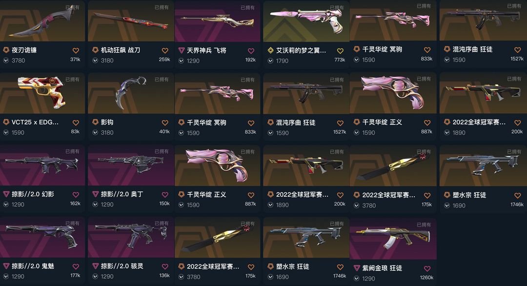 可排✅混沌塑水宗紫金★掠夺22冠军套★影钩战刀夜刃诡镰★千灵华绽★猫猫鬼魅★vct标配★天界飞将