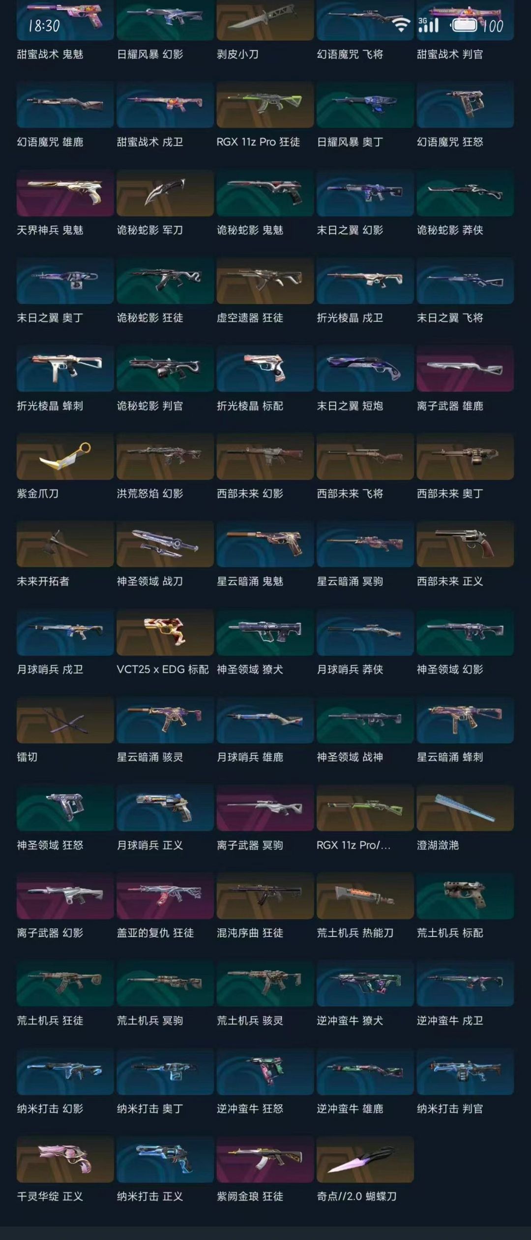 装备描述:随身武器:(千灵华绽 正义 炫彩2);(千灵华绽 正义 炫彩3);(毁灭骑士 正义 炫彩3);(毁灭骑士 正义 炫彩1);(西部未来 正义 炫彩3);(西部未来 正义 炫彩1) 步枪:(盖亚的复仇 狂徒 炫彩3);(盖亚的复仇 狂徒 炫彩2);(侦察力量 幻影 炫彩2);(侦察力量 幻影 炫彩3);(混沌序曲 狂徒 炫彩2);(混沌序曲 狂徒 炫彩1);(西部未来 幻影 炫彩1);(西部未来 幻影 炫彩3);(虚空遗器 狂徒 炫彩1);(虚空遗器 狂徒 炫彩3);(光荣异象 狂徒 炫彩2);(光荣异象 狂徒 炫彩3);(超时空卫队 狂徒 炫彩2) 狙击步枪:(RGX 11z Pro//3.0 莽侠 炫彩2);(RGX 11z Pro//3.0 莽侠 炫彩3);(西部未来 飞将 炫彩1);(西部未来 飞将 炫彩3) 机关枪:(西部未来 奥丁 炫彩1);(西部未来 奥丁 炫彩3);(西部未来 奥丁 炫彩2) 近战武器:(奇点//2.0 蝴蝶刀 炫彩1);(镭切 炫彩2);(镭切 炫彩3);(未来开拓者 炫彩1);(未来开拓者 炫彩3);(影钩 炫彩2)