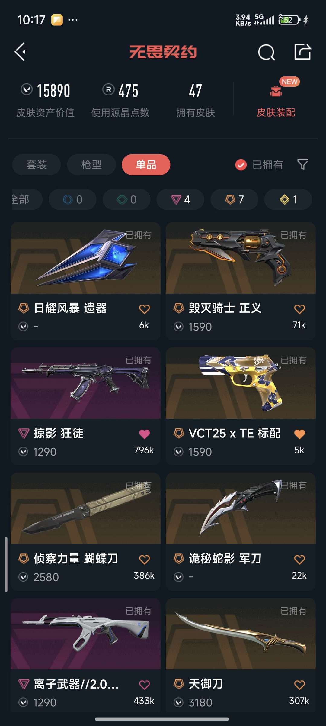 装备描述:毁灭骑士正义,猫猫鬼魅,离子掠影ak,般若幻影,刀皮有侦查蝴蝶刀,天御刀,还有起源大狙,战队手枪