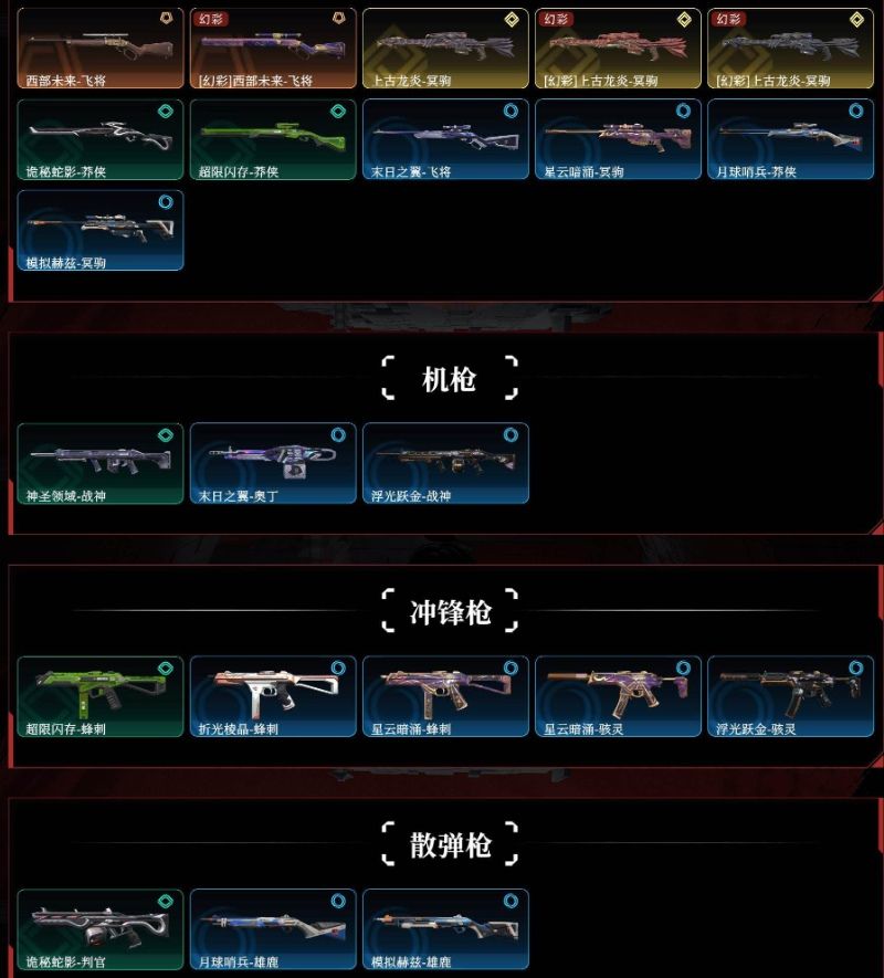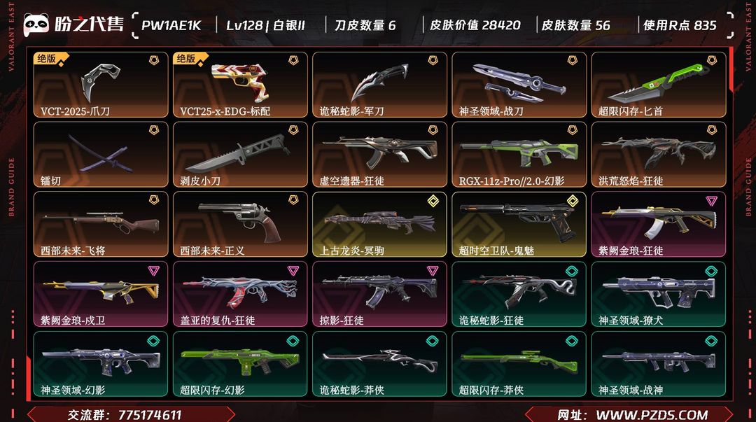 装备描述:可排位✨精品库存1000R✨VCT爪刀/雷切/剥皮✨虚空/流脓/盖亚/紫金/掠影狂徒✨显卡幻影/紫金戍卫✨西部飞将/龙狙✨西部正义/超时空鬼魅/VCT标配✨