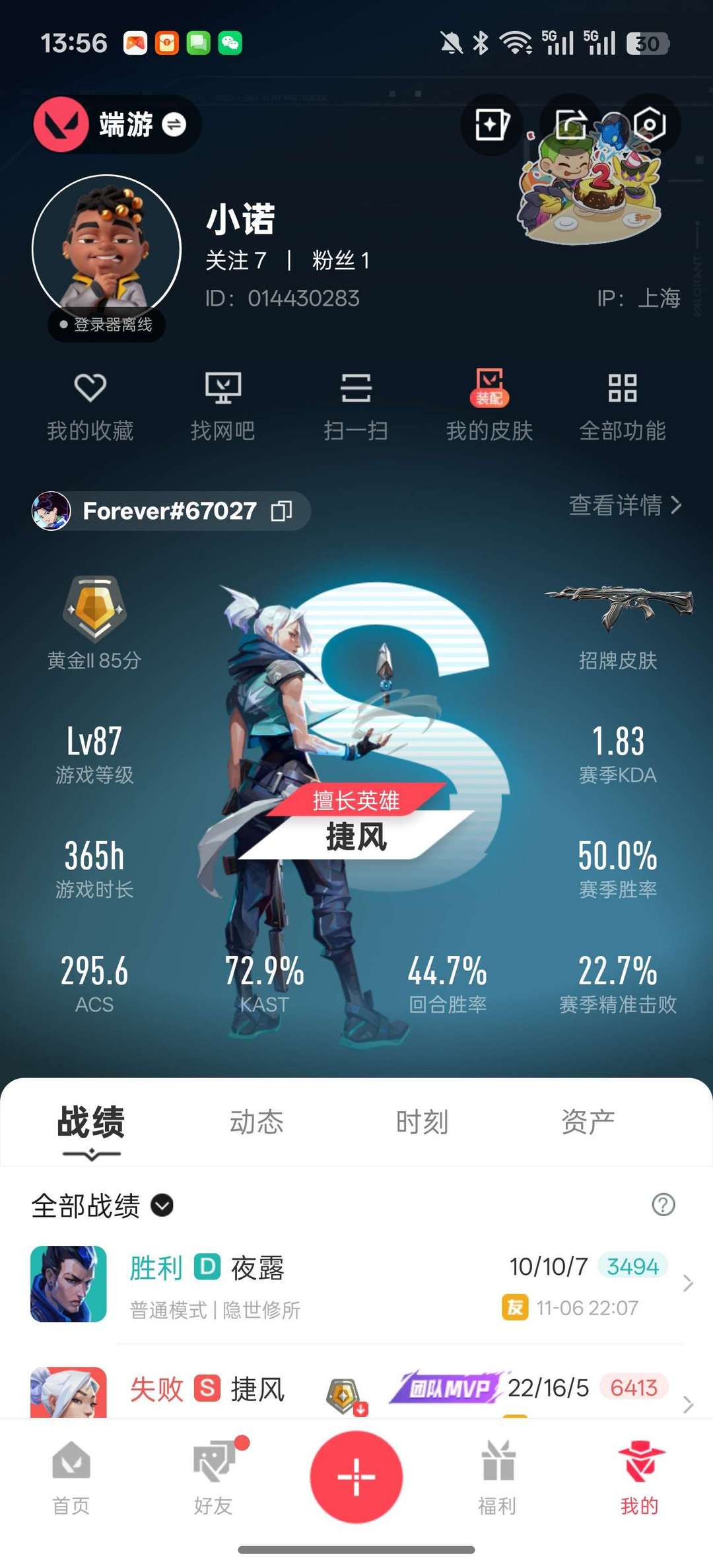 段位如图,有堕天ak加般若假面幻影,可排位可匹配,适合带妹炸鱼上分