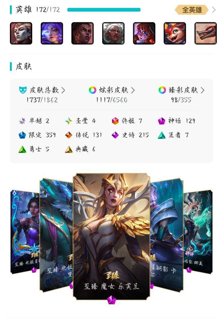 【比尔吉沃特】【联盟四区可开黑】最新卢娜神话妄想,1737皮肤,神话129,名人堂双签名版