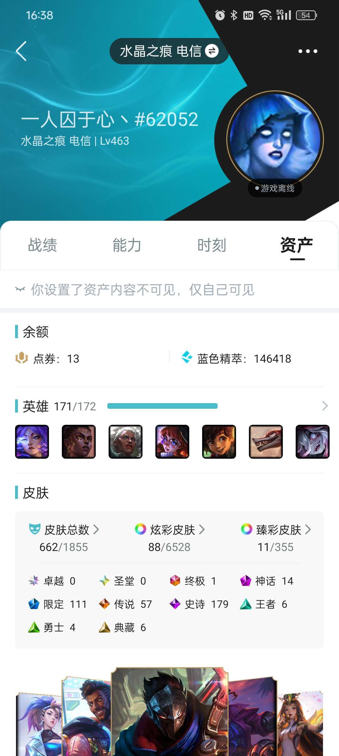皮肤662全英雄172炫彩88臻彩11神话14限定111传说57可排位可娱乐