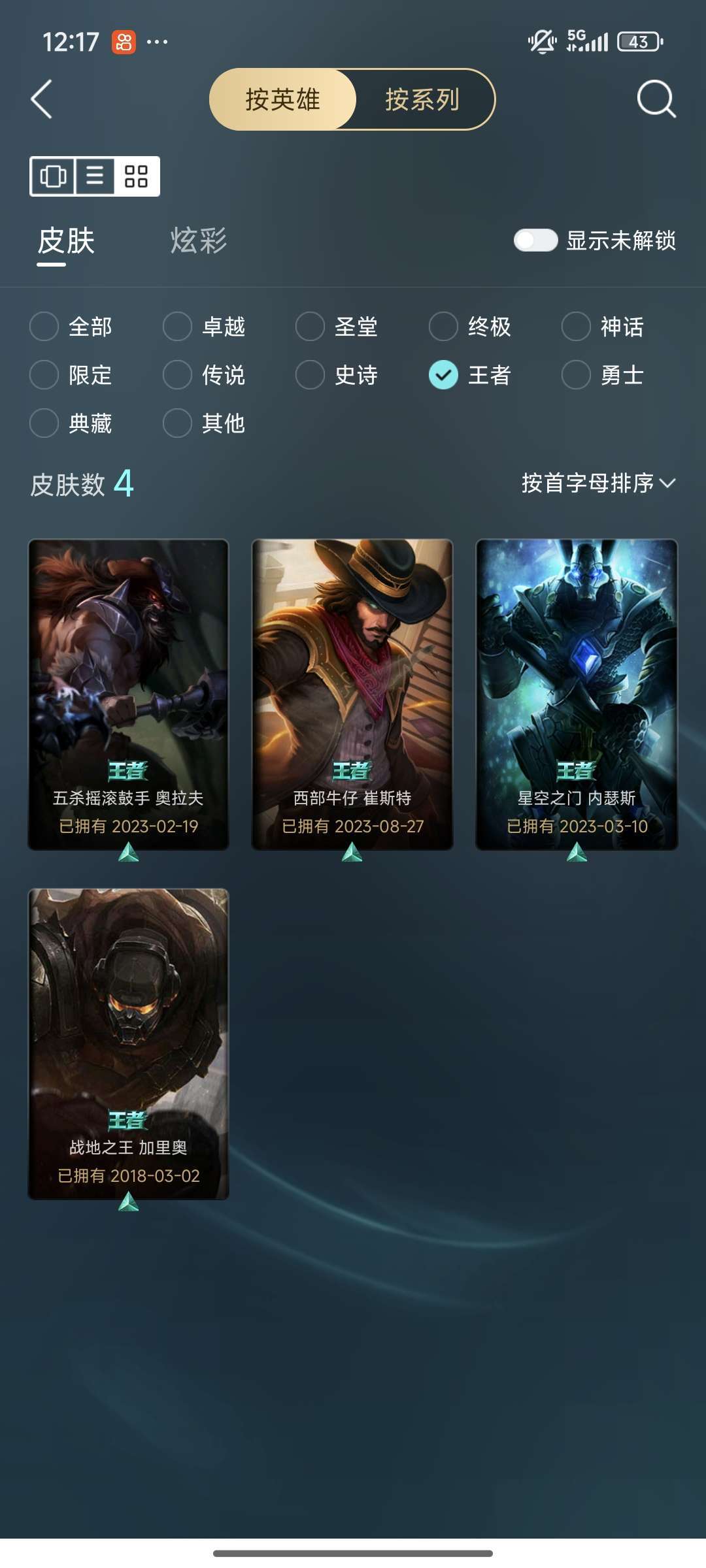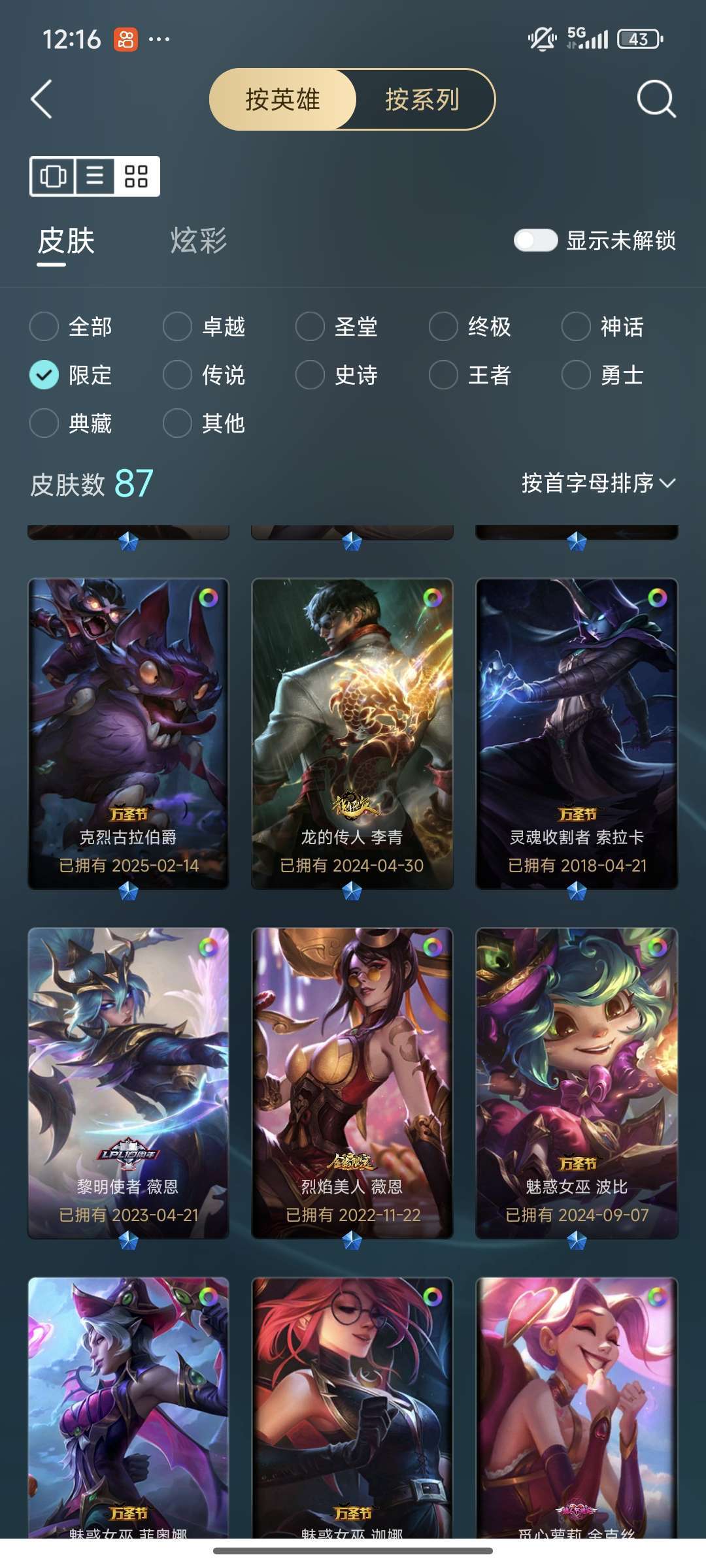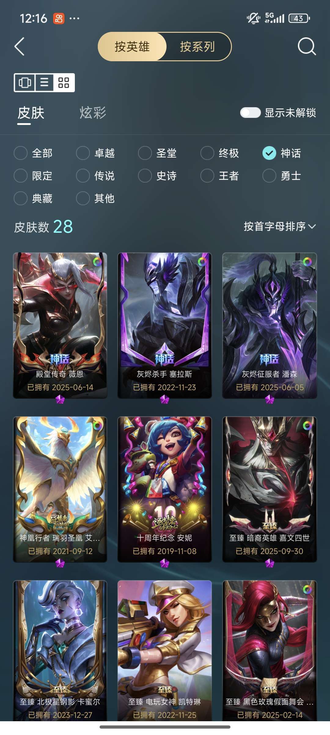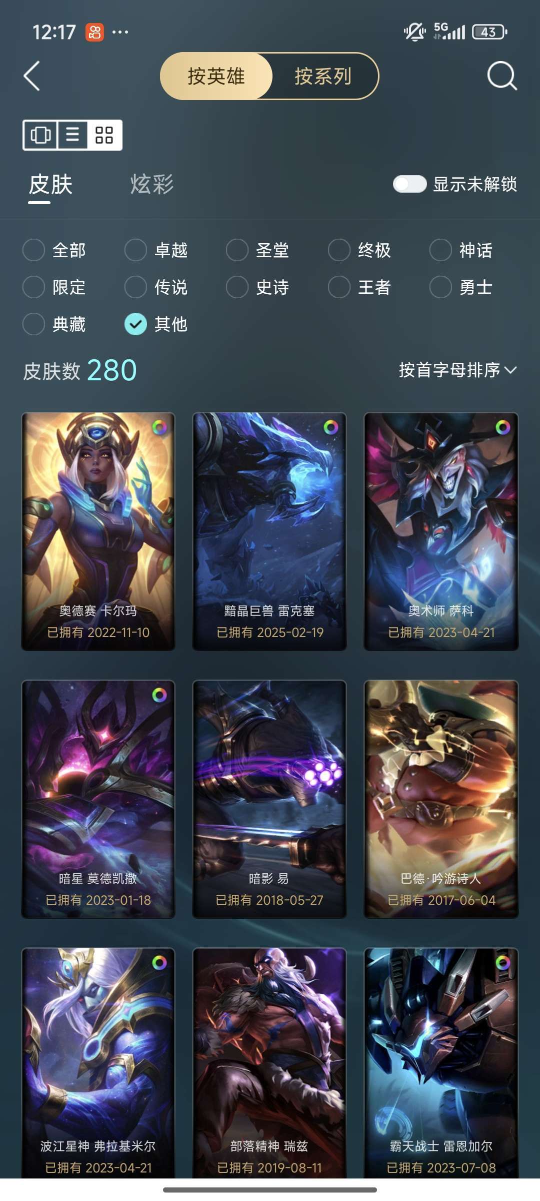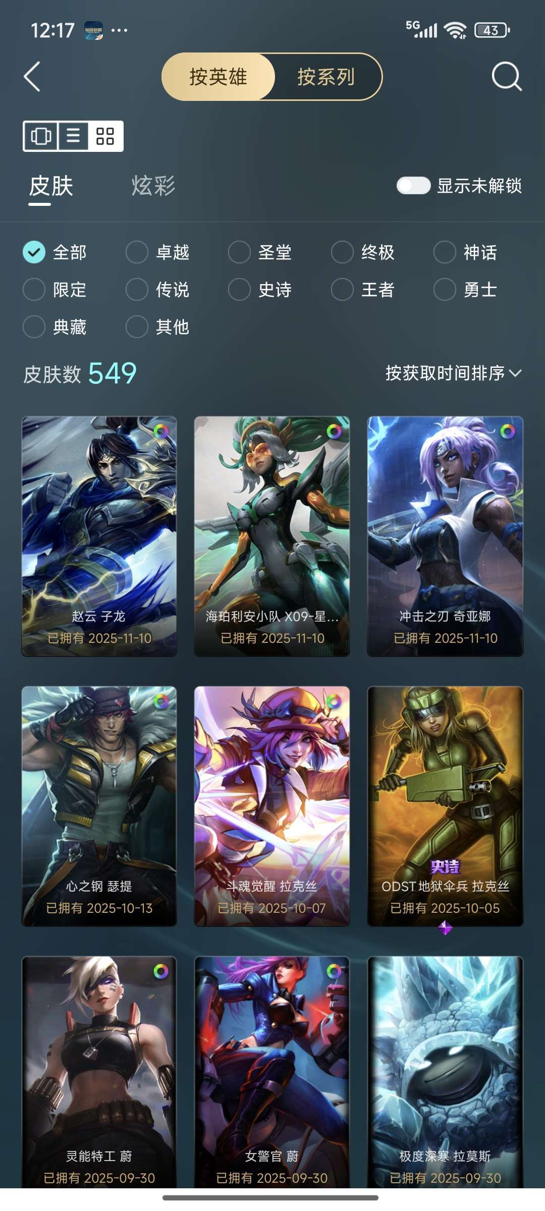 皮肤有549个,炫彩143个,限定皮肤88个,传说皮肤50个,神话皮肤28个。