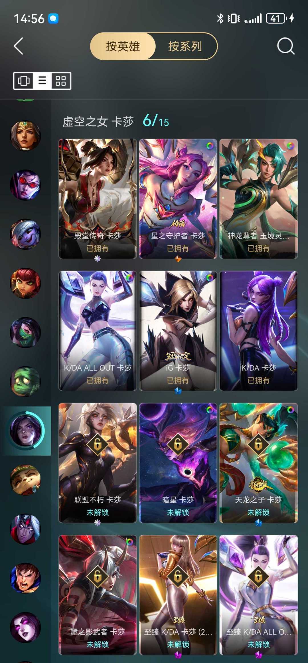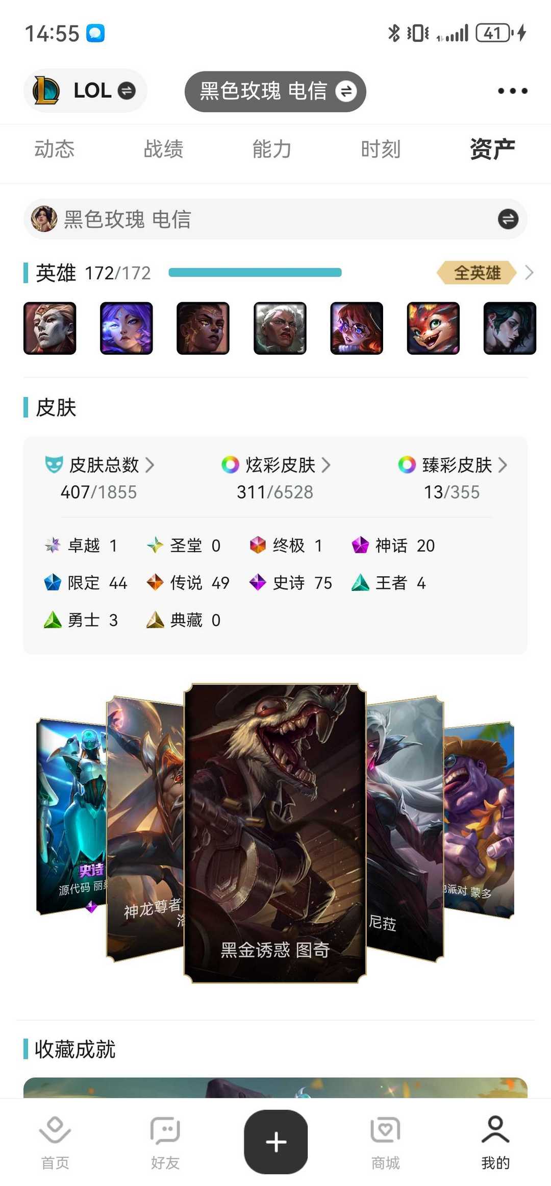 黑色玫瑰,总共731皮,407精皮(都是近几年的新皮,殿堂VN卡莎都有)+311炫彩,白银可单双。