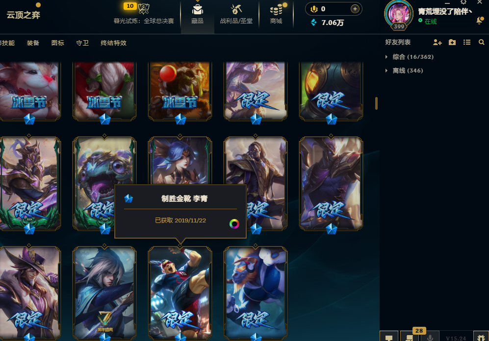 800皮肤全英雄黄金可排位创战纪海克斯鳄鱼冰雪剑圣小炮波比周年男刀限定李青灵魂莉莉娅黑暗骑士赵信