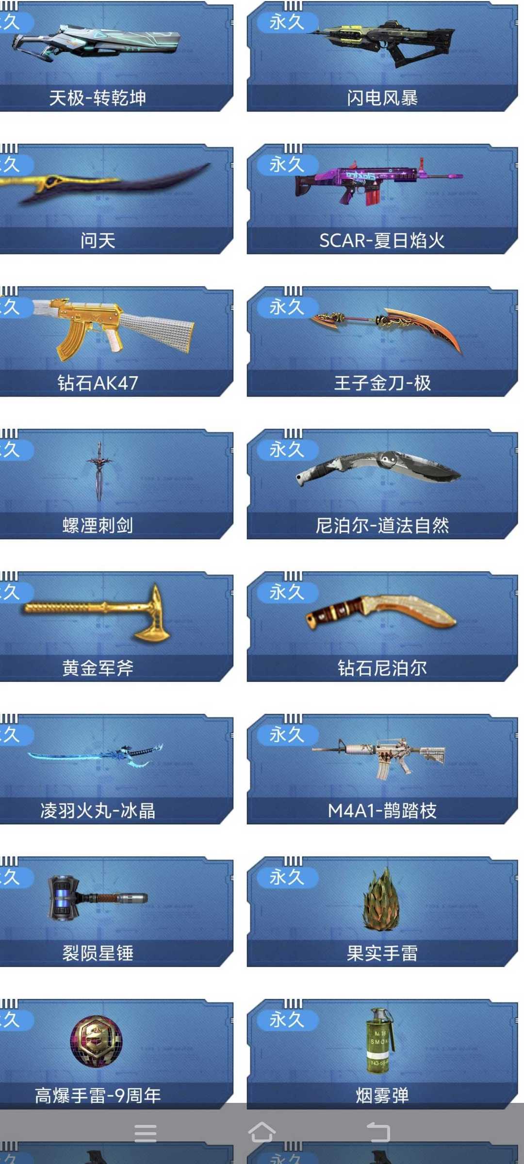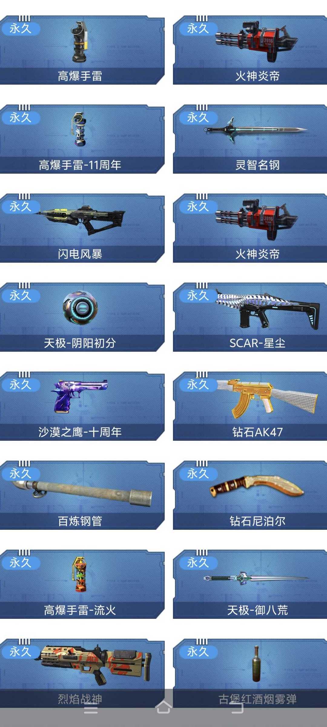 SCAR-星尘,SCAR-火凤,天极-阴阳初分,雷鸟,灵智名钢,高爆手雷-剑齿银虎,天极-转乾坤,