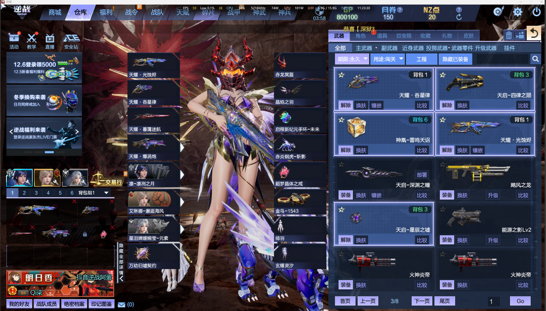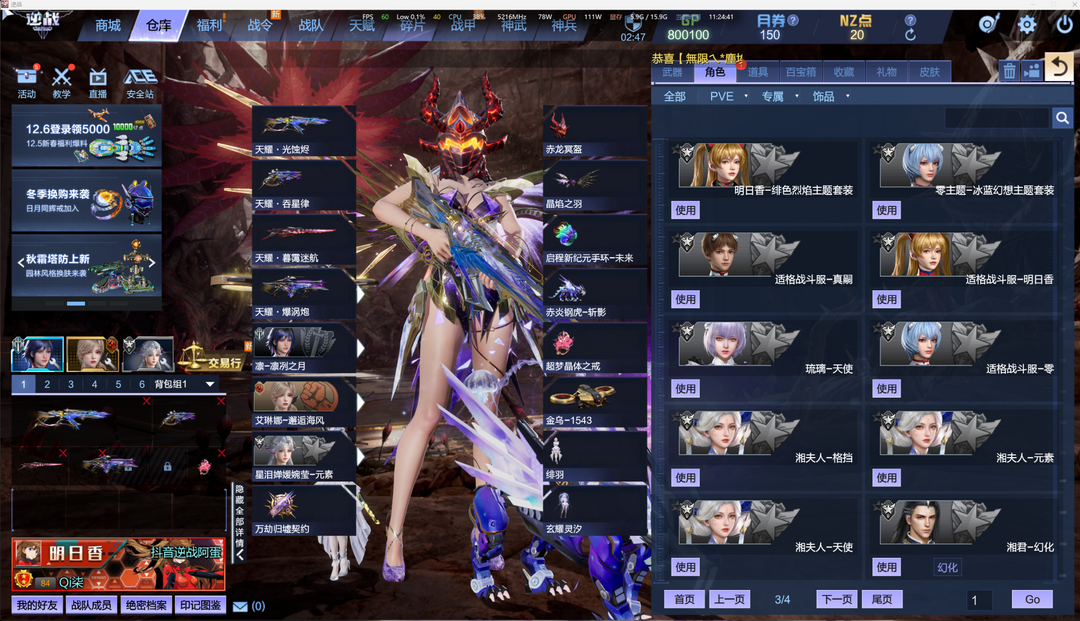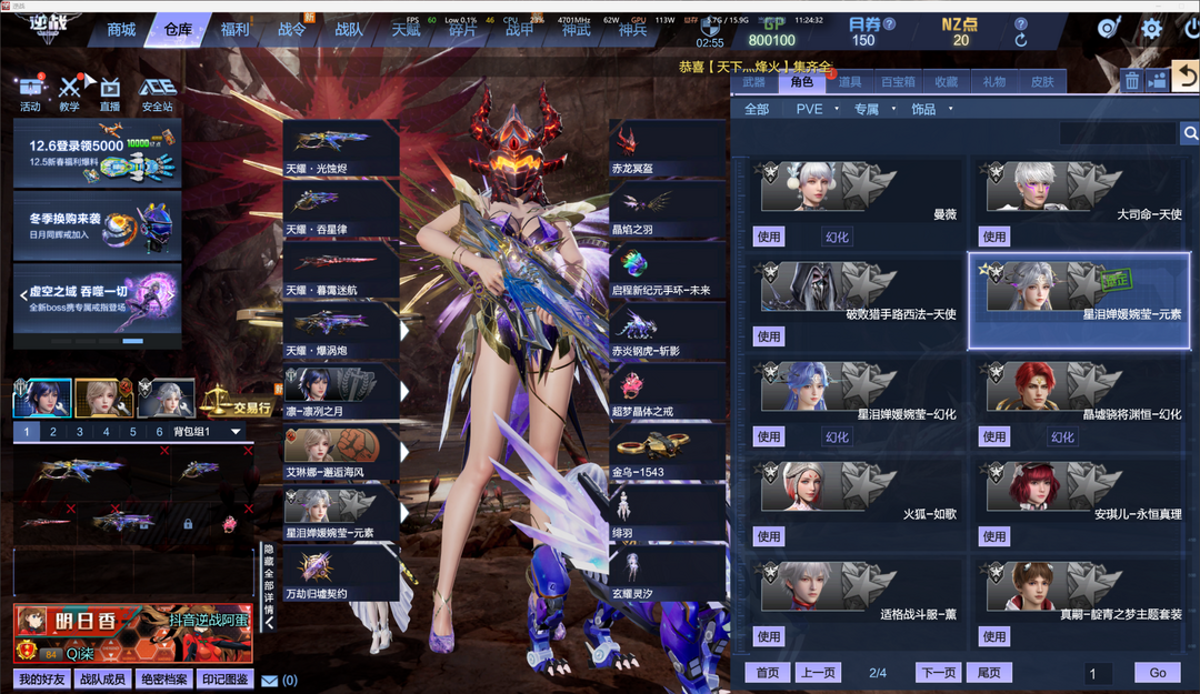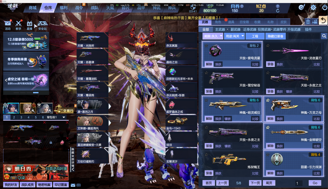 装备描述:【套装】天耀套/神凰套/天帝套/陨星套/天启-湮灭之影/天启-四律之陨/天启-终末之刃/天启-星辰之墟/天启-深渊之瞳/创世巨炮-盖亚/天鲲激光炮 【优质武器】黄金之翼/能源之影 【角色】精绝女王-幻化/大元素使-安娜/晶墟骁将渊恒/艾琳娜-邂逅海风/星泪婵媛婉莹/零主题-冰蓝幻想主题套装/明日香-绯色烈焰主题套装/真嗣-靛青之梦主题套装/适格战斗服-真嗣/适格战斗服-明日香/适格战斗服-零/卡珊 【头饰】赤龙冥盔 【背饰】赤红战翼 【戒指】耀阳苍龙之戒/狄刻之心/灵蝶之戒/血魄之戒 【手环】女情侣手环-婵娟共此时 【神武】绀蓝暗域/十周年限定词条 【塔防英雄】英雄游侠/英雄铁卫-爽柠/英雄领主/英雄大魔导师/英雄强盾/英雄焚霄