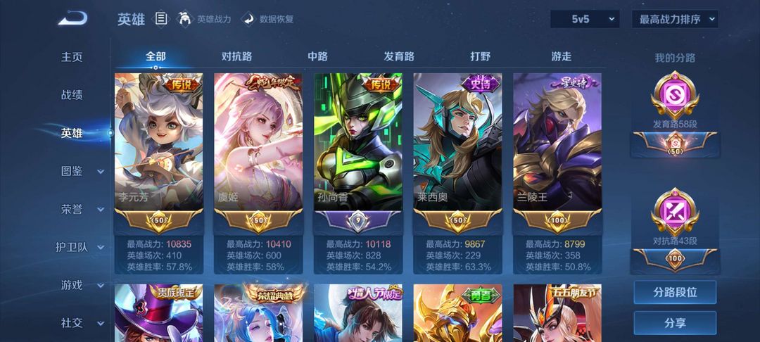 411皮,3典藏,3珍品全能大师,58段发育路,43段对抗路,41段打野