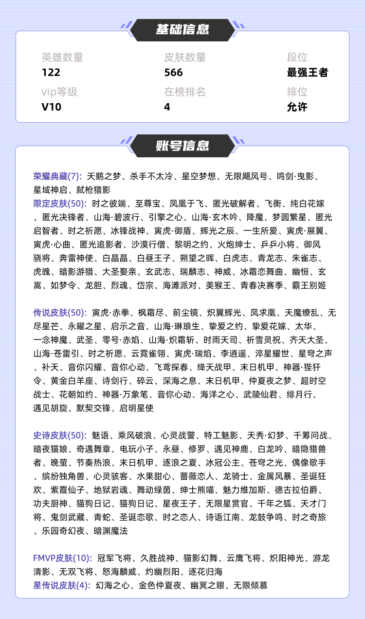装备描述:>>>>>>毁号,涉及毁坏虚拟财产罪及计算机安全罪,请文明游戏素质游戏,让我们共建美好租号平台>>>>>> 本游戏账号: ,英雄多,皮肤多。典藏皮肤7个,全FMVP皮肤,全七夕限定,全年限,全情人节限定,全kpl限定,全520限定,全周年限定及五五限定,私人英雄皮肤有:孙尚香 杀手不太冷||李白 鸣剑·曳影||诸葛亮 星域神启||韩信 弑枪猎影||夏侯惇 无限飓风号||鲁班七号 星空梦想||小乔 天鹅之梦杨戬 永曜之星||百里守约 碎云||周瑜 音你心动||梦奇 胖达荣荣||关羽 武圣||李信 一念神魔||李信 山海·炽霜斩||孙尚香 音你闪耀||孙尚香 末日机甲||孙尚香 异界灵契||孙尚香 乘龙·问璇玑||李白 凤求凰||李白 诗剑行||诸葛亮 时雨天司||诸葛亮 武陵仙君||诸葛亮 鹤羽星尊||上官婉儿 神器·万象笔||上官婉儿 妄想奇谈||孙悟空 零号·赤焰||孙悟空 齐天大圣||李元芳 飞鸢探春||安琪拉 追逃游戏||大乔 挚爱花嫁||大乔 时之奇旅||墨子 黄金天蝎座||狄仁杰 神器·狴犴令||狄仁杰 超时空战士||狄仁杰 夜礼服假面||后羿 无尽星芒||王昭君 星穹之声|