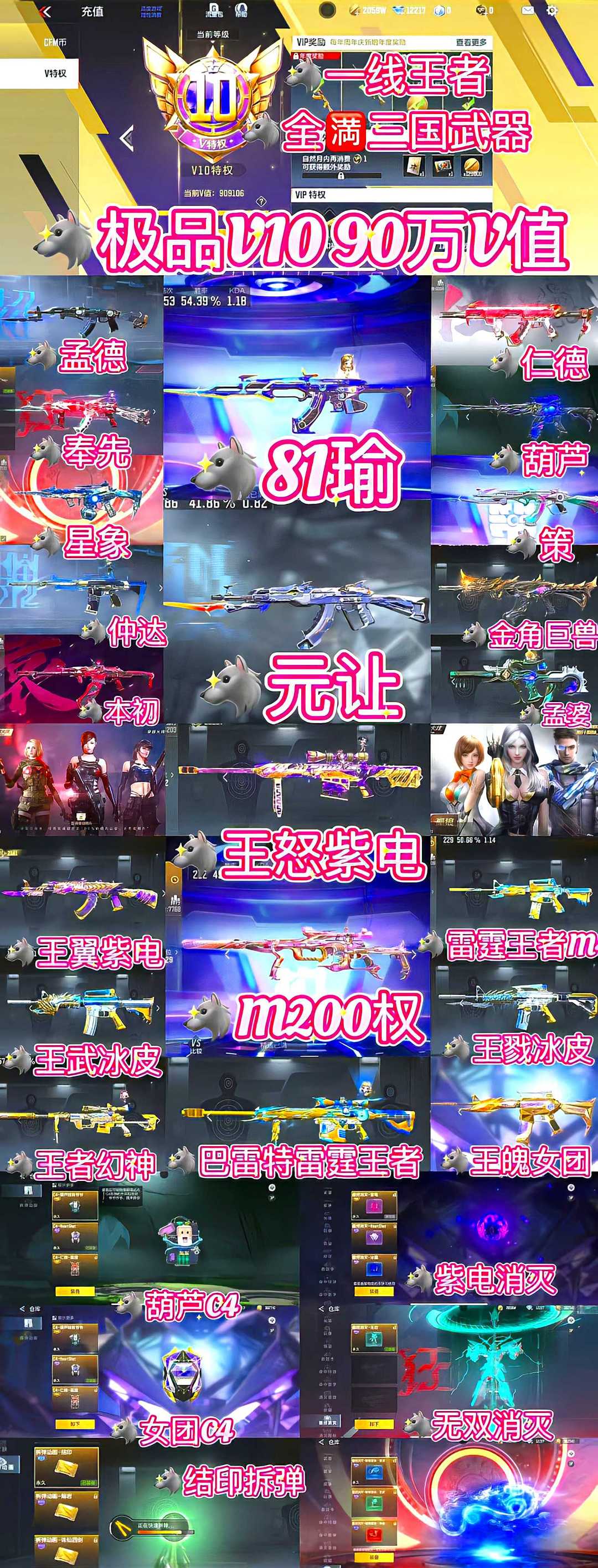 装备描述:>>>>>>毁号,涉及毁坏虚拟财产罪及计算机安全罪,请文明游戏素质游戏,让我们共建美好租号平台>>>>>> 本游戏账号:英雄武器355个, 王者武器59个。军衔: 荣耀元首,段位: 大师S生化模式顶级装备全都有! V10神豪七同框紫电翼至尊❤️M200-权、巴雷特雷霆王者至尊套、全满三国武器、①④把COP、结印拆弹动画、④个最终消灭“紫电最终消灭、奉先无双最终消灭、青龙最终消灭、过载最终消灭”、M4雷霆王者至尊、宙斯套装、本初套装、MK金角巨兽套装、星象四圣套装、81瑜套装、奉先无双套装、肿达过载套装、元让套装、孟德过载套装、定军套装… 角色“孤狼-X、孙尚香-X、春、步练师、蔡文昭、雅典娜、全女团角色、蝴蝶、蝉、九尾狐、子涵、乔月” 生化爆破挑战都是最顶级装备!!!!!!!!! 生化装备最顶级!全部有!!! 六王烈王者之蝶、双脊龙、孟婆、 巴雷特雷霆王者大炮、aa12雷霆王者 宙斯、本初、黑龙魂、 螳螂