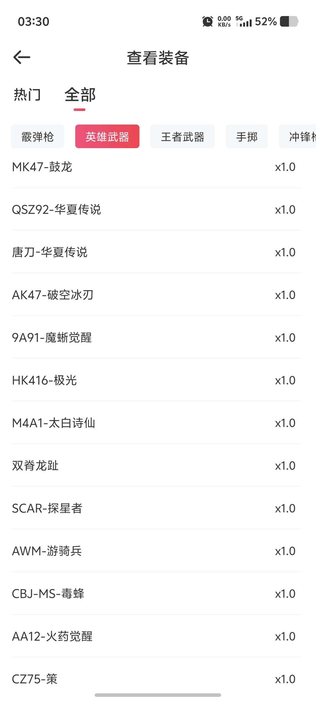 两把王者武器,40把英雄级,近战较多,狙击枪有游击兵