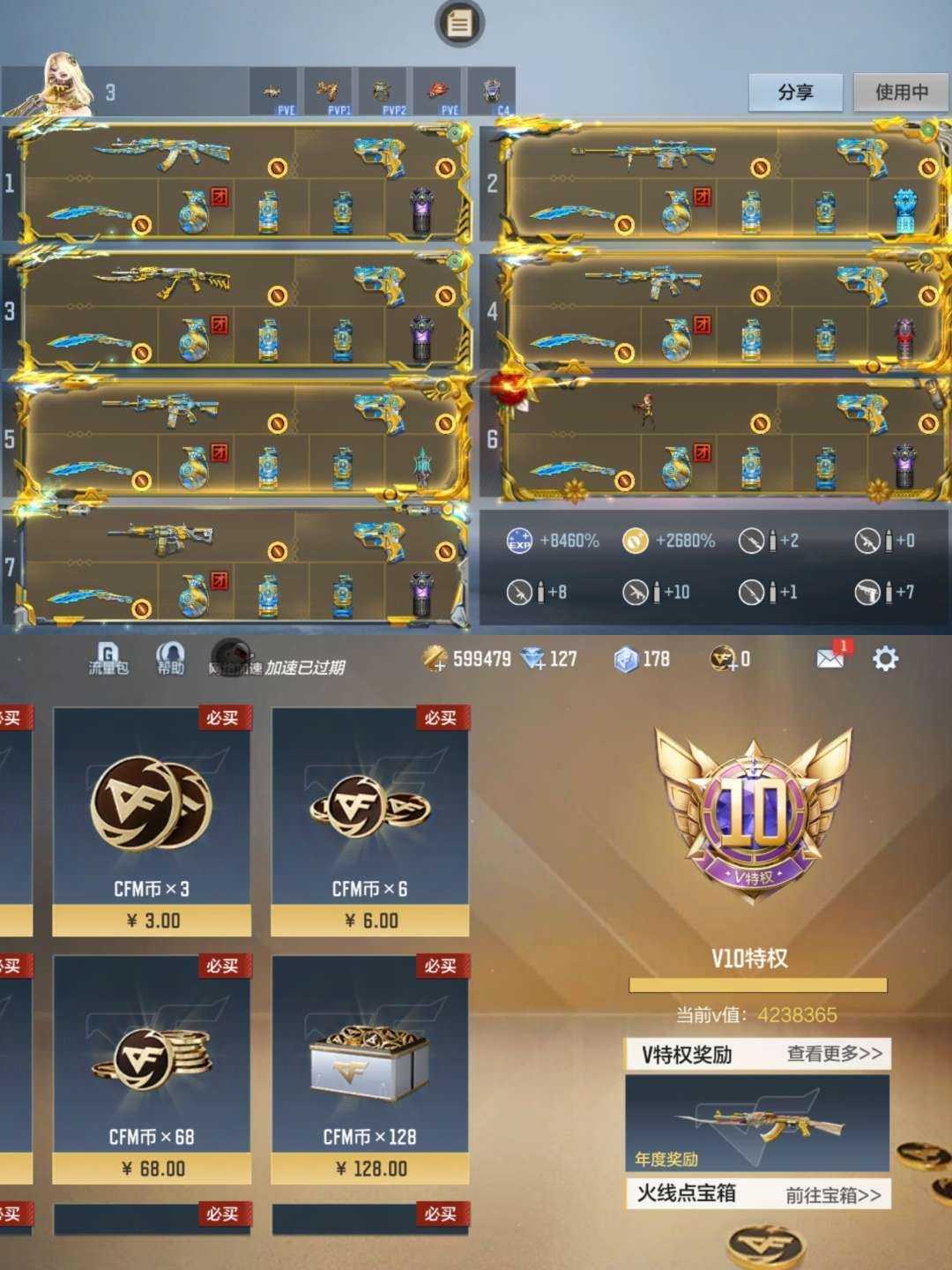 装备描述:最强CF❤️榜前5❤️五百万V值❤️不良人深海猎手毕业❤️所有活动全拉满❤️全紫电炫金王者三国❤️