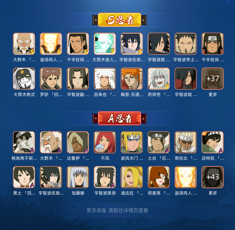 装备描述:344忍 全忍法帖高招 三个初代 四个宇智波斑 死活二代火影 百豪纲手 白面具 罗沙 百豪樱 秽土迪达拉 青年长门 鹰佐骨架 金鸣仙鸣 三代四代雷影