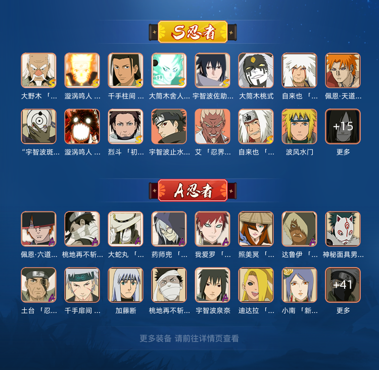装备描述:黑绝,侠隐照美冥,漂泊带土,漂泊再不斩,漂泊扉间,漂泊超,侠隐纲手(专属通灵),侠隐兜,到时间不顶号(九号秒侠隐佐助,关注第一时间玩)