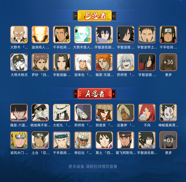 装备描述:暴怒六尾,大筒木舍人,须佐止水,鬼灯幻月,艾四代目雷影,宇智波斑秽土转生,烈斗,传说三忍自来也,千手扉间秽土转生,漂泊带土