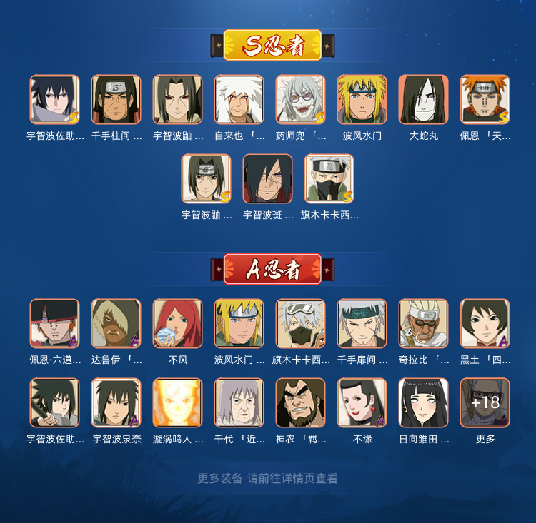 装备描述:稀有忍着 漂泊带土,漂泊扉间,漂泊佩恩还有元气卡卡西,万花筒卡卡西,解斑,通灵到蛤蟆龙,各种人气忍者,