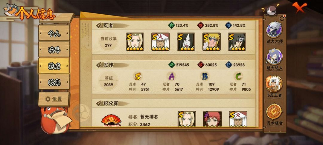 47个S级忍者❤️70个A级忍者❤️2千金币❤️通灵有熊猫❤️战力本服排行36名❤️欢迎租购!