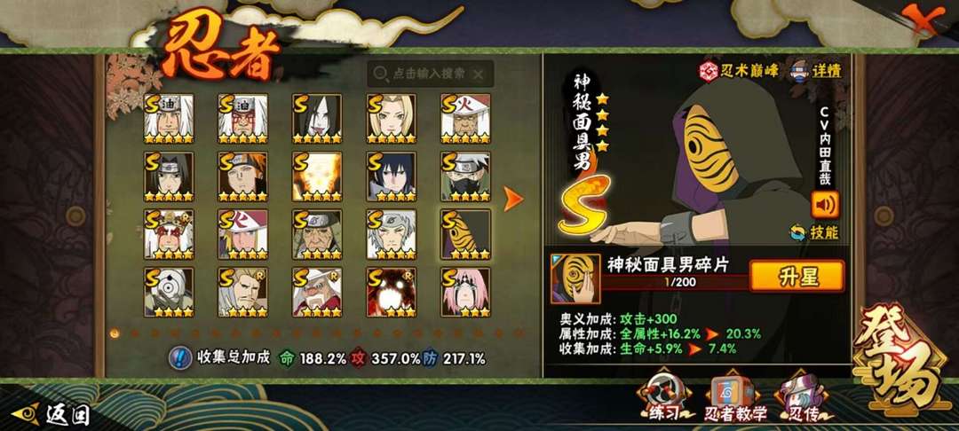 409真全忍者✨侠影佐助全套✨全皮肤74级魅力✨全通灵✨3600w✨53S✨101A✨黑绝✨全场景✨