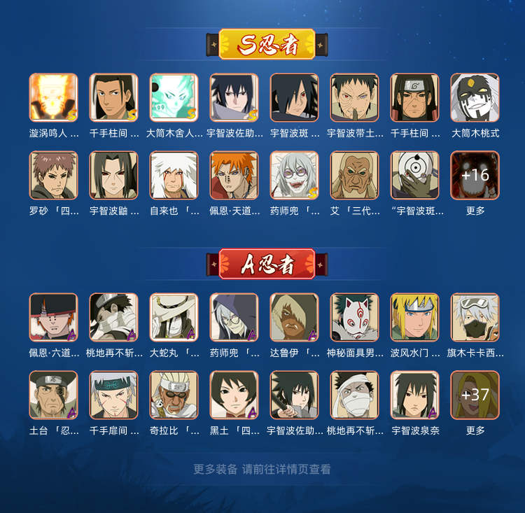 装备描述:请游戏局内保持文明,防止禁言影响他人游戏,祝您玩得愉快! 31S 54A 278忍者 桃地再不斩「漂泊武士」/蝎 「绯流琥」/佩恩·六道 「漂泊浪客」/宇智波带土 「漂泊浪客」/神秘面具男 「红夜之刃」/宇智波斑 「秽土转生·解」/千手柱间 「木叶创立」/宇智波止水 「须佐能乎」/漩涡鸣人 「九喇嘛连结」/大筒木舍人 「最终章」/宇智波斑「白面具」/艾 「忍界大战」/宇智波带土「忍界大战」/宇智波佐助 「永恒万花筒」/大筒木桃式/佩恩·天道「超」/旗木卡卡西 「须佐能乎」