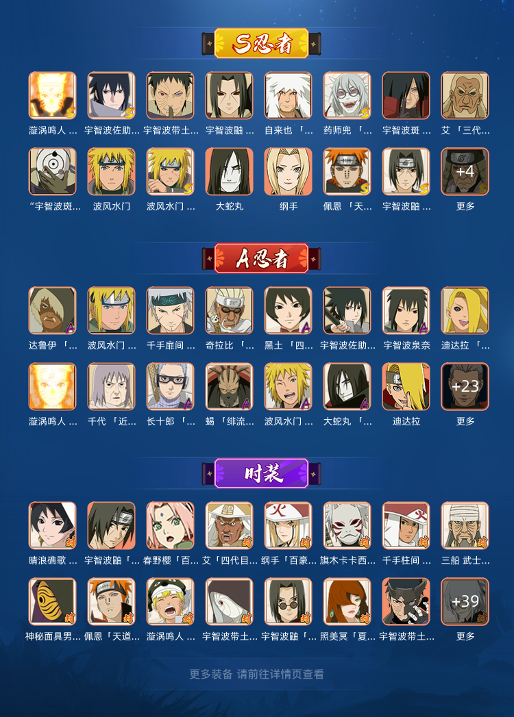装备描述:暗部三,娱乐号,忍者在下面的图片里有写,有白面具,秽土斑,秽土解斑,龙兜,通灵有大部分的免费通灵之类满足部分娱乐