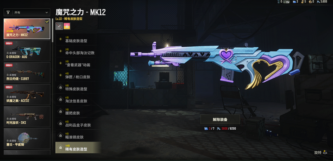 ④级魔咒之力MK12✅鎏金王朝M762✅魔力甜心AKM✅鎏金王朝98K✅镀金SKS✅群雄逐鹿M4✅海