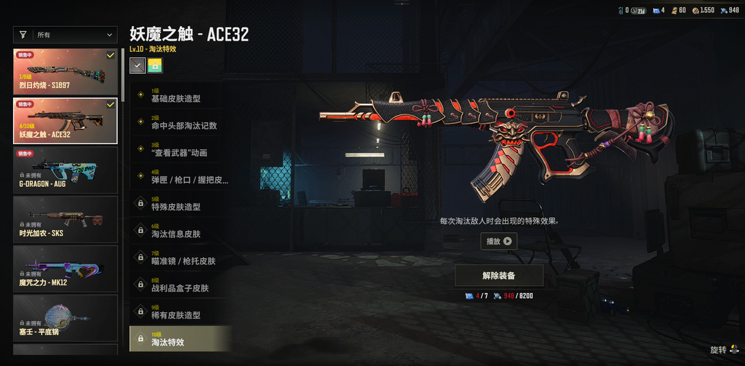④级妖魔之触ACE✅①级烈日烧灼S1897✅金色落叶M4✅湮灭M762✅魔力宝贝SLR✅水手SLR✅