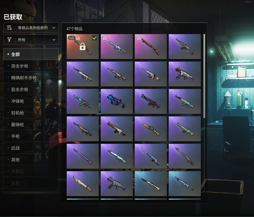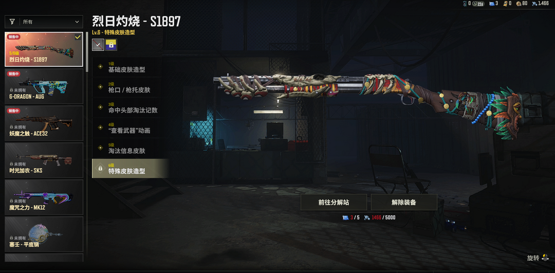 ⑤级烈日烧灼S1897✅✅灵魂枷锁AKM✅群雄逐鹿M4✅毒液M762✅幸运骑士SKS✅大理石SLR✅