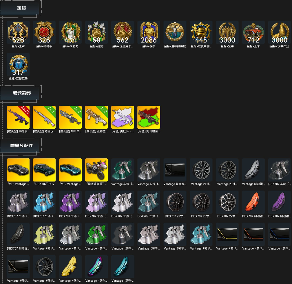 装备描述:---家里不要租 家里电脑玩不了--- 保时捷911+轿车/满马丁/双尼尔套/双小丑/满级异色美杜莎/异色刻耳柏洛斯M249/ 危险玩偶屋 SLR/亚特兰蒂斯 DBS[2级]/拉风龙大礼包/湛蓝狂怒之雾M79/紫色魔法迷雾M79/拉风龙大礼包/悲喜大礼包/黄东/绿东/悲喜套/小战神/白战神/白熊套/大金牙/滑雪镜/萨芬裤/白虎背包/马东锡面容/神圣独角兽摩托车/音响舞