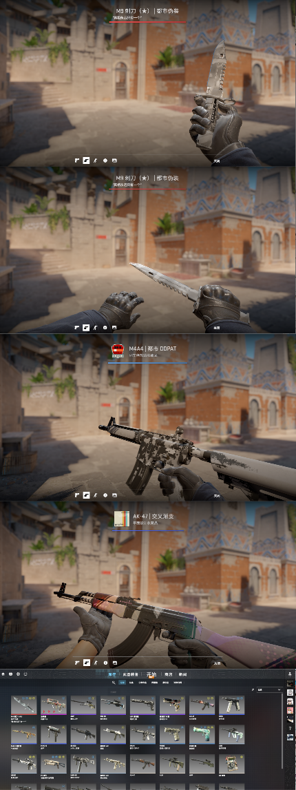 装备描述:完美老兵丶 M9刺刀都市伪装⭐awp蠕虫之神⭐ak47交叉渐变⭐m4都市doat⭐主战齐全