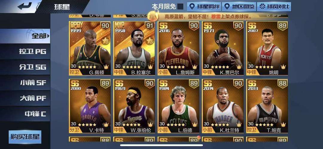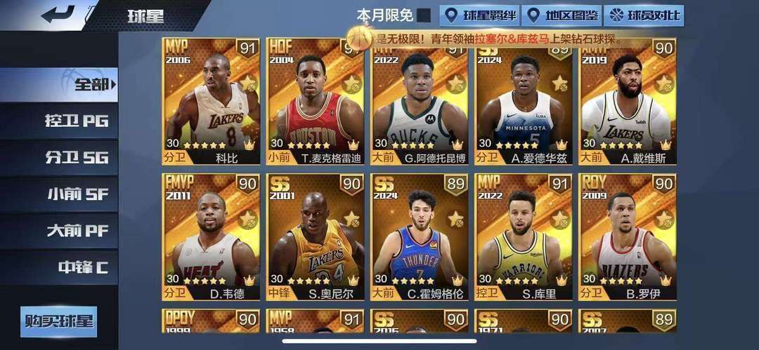 44★可排位★专业★5天选★库里屠龙科字母麦迪鲨鱼霍姆格伦韦德爱德华兹佩顿罗伊拉塞尔伯德