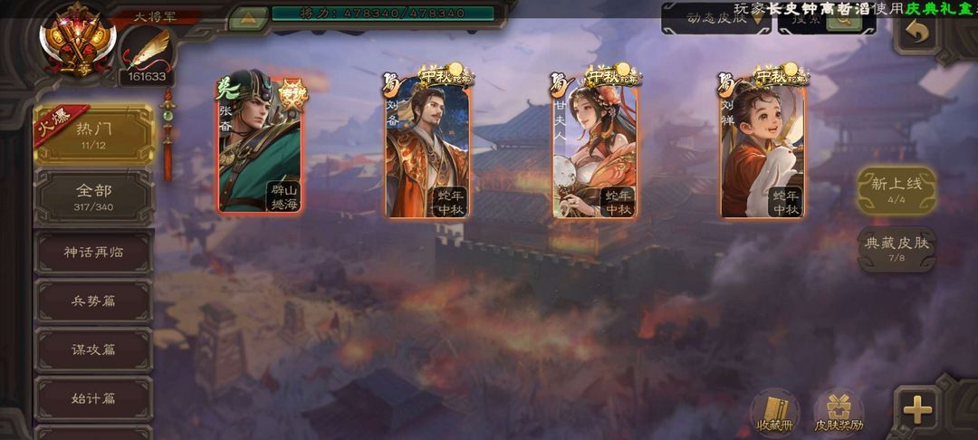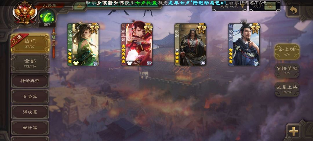 有卡,V32大元帅同款VIP排面拉满,47.8w将力史诗武将星级全满,最新势国渊及张奋新回廊已有