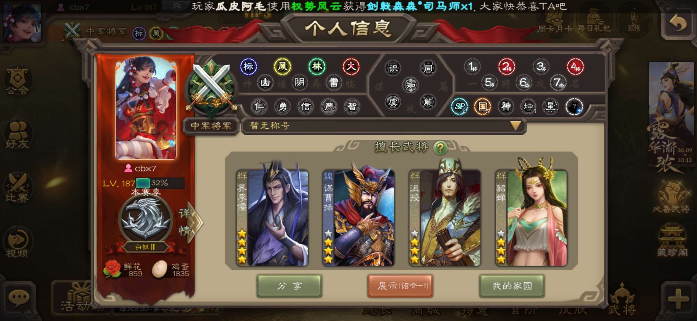 装备描述:谋曹操界李儒203武将中军将军,缺少特别厉害的武将中规中矩的一些武将但是也可以体验快乐,还是比较可以的账号