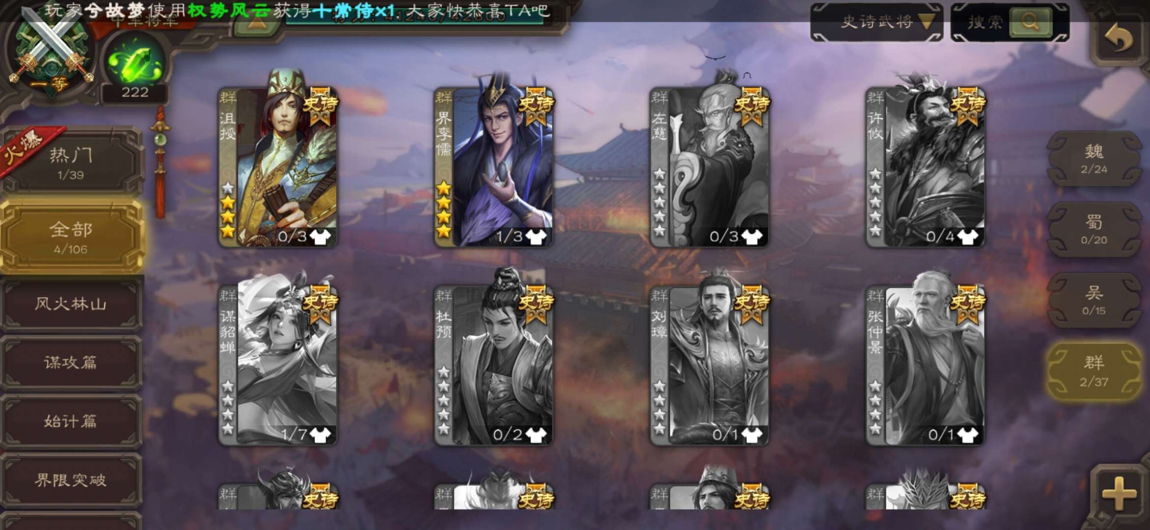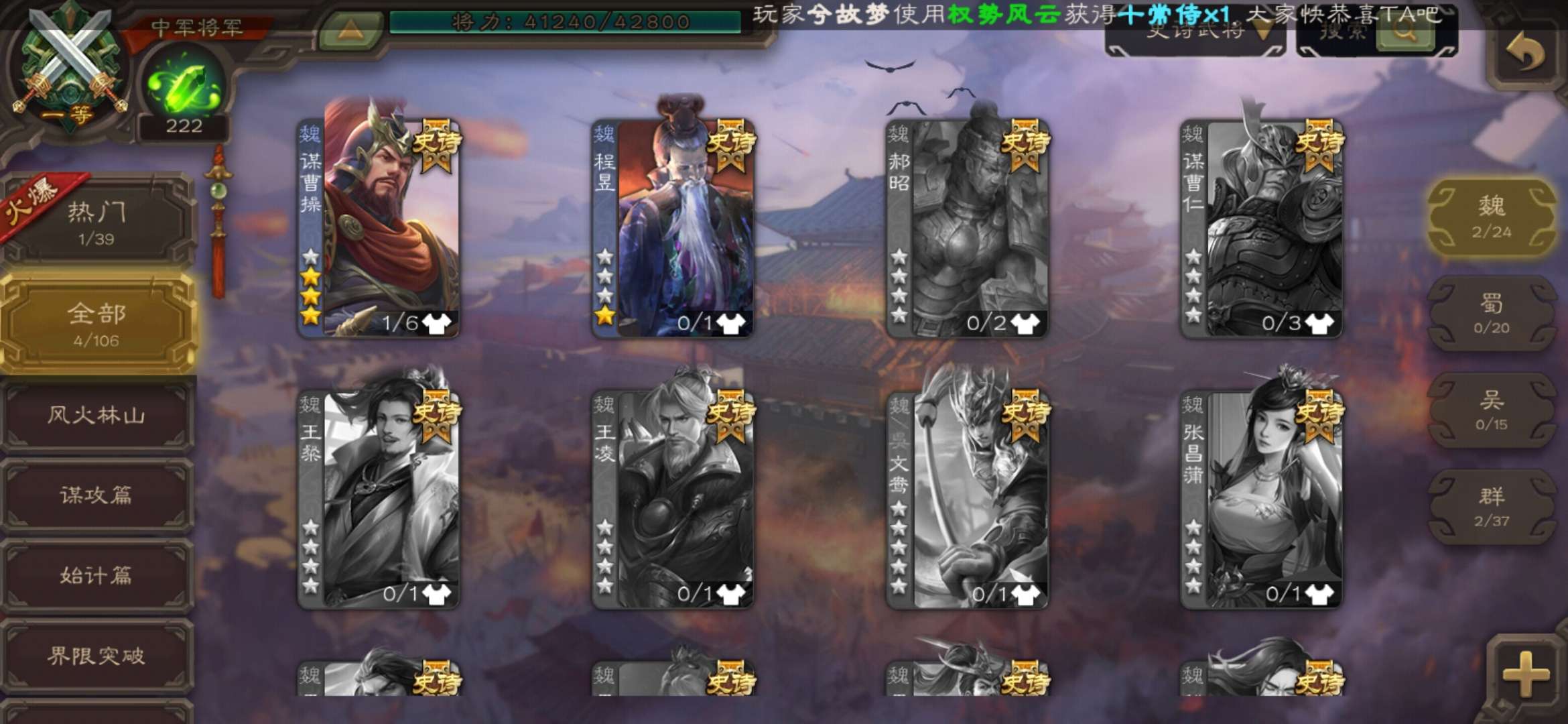 谋曹操界李儒等4个史诗武将,可以小小体验快乐。
